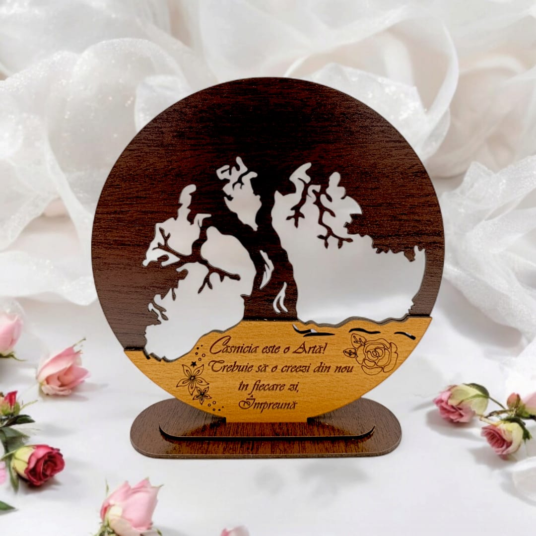 Realizat din lemn de calitate superioară, cu detalii fine și un design atent lucrat, Copacul Vieții poate fi personalizat cu mesajul dorit, oferindu-ți posibilitatea de a-l face cu adevărat unic și de a adăuga o notă personală oricărui spațiu. Fie că este vorba de un cadou pentru cei dragi, fie că vrei să-l integrezi în decorul propriei case sau birou, acest produs aduce un mesaj profund de armonie și continuitate.