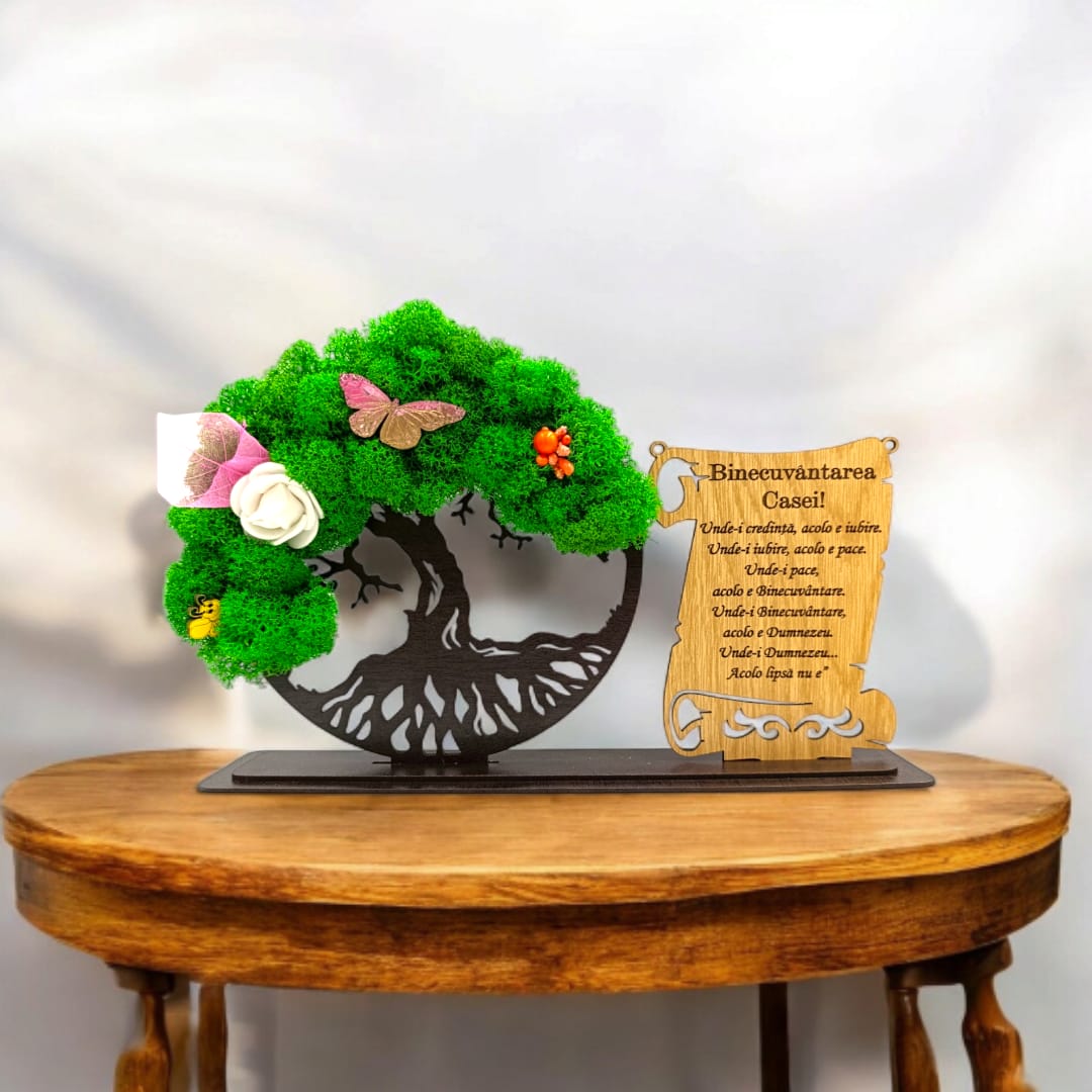Cadou personalizat, Copacul vietii cu licheni si placuta, mesaj standard pentru Binecuvantarea Casei, dimensiune 30x18cm, wenge