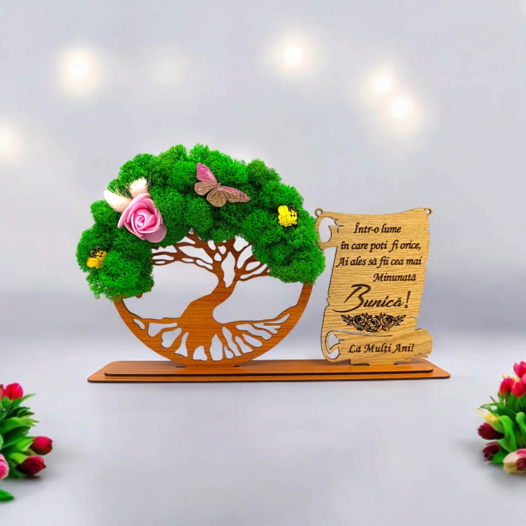 Cadou personalizat, Copacul vietii cu licheni si placuta, mesaj standard pentru Bunica ,dimensiune 30x18cm
