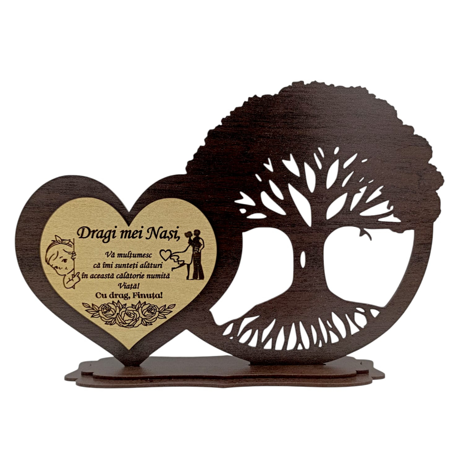 Această decorațiune din lemn 30x16 cm, realizată manual în România, este alegerea ideală pentru Nași, Fini, Nuntă sau Botez. Cu un design rafinat – inimă și copac al vieții, simbol al dragostei, unității și legăturilor spirituale, produsul devine un dar de neuitat pentru cei care contează cu adevărat.