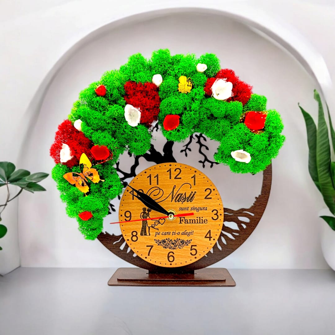 Cadou personalizat, Ceas decorativ copacul vietii cu mesaj standard pentru Nasi, decorat cu licheni stabilizati si flori decorative naturale, wenge