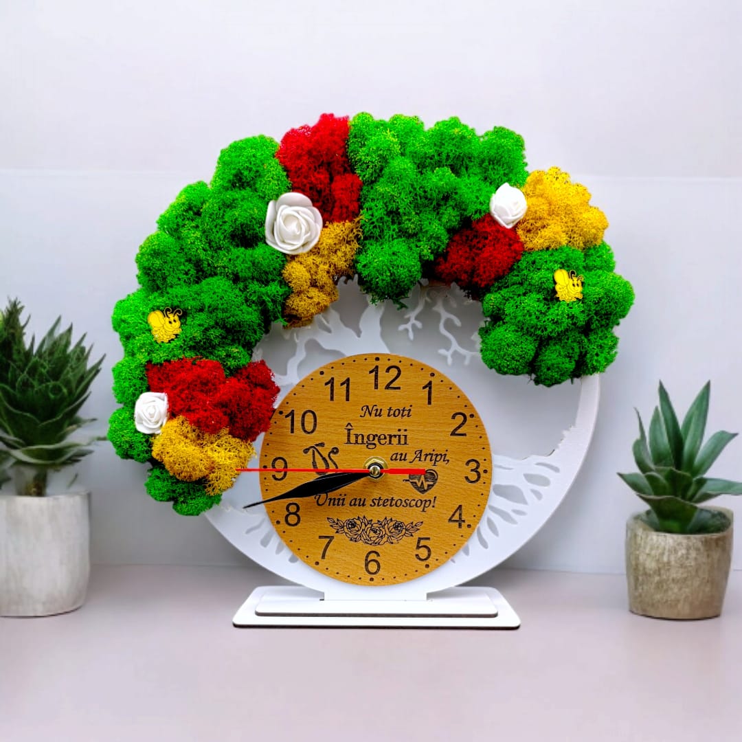 Cadou personalizat, Ceas decorativ copacul vietii cu mesaj standard pentru Medic/Doctor, decorat cu licheni stabilizati si flori decorative naturale, alb