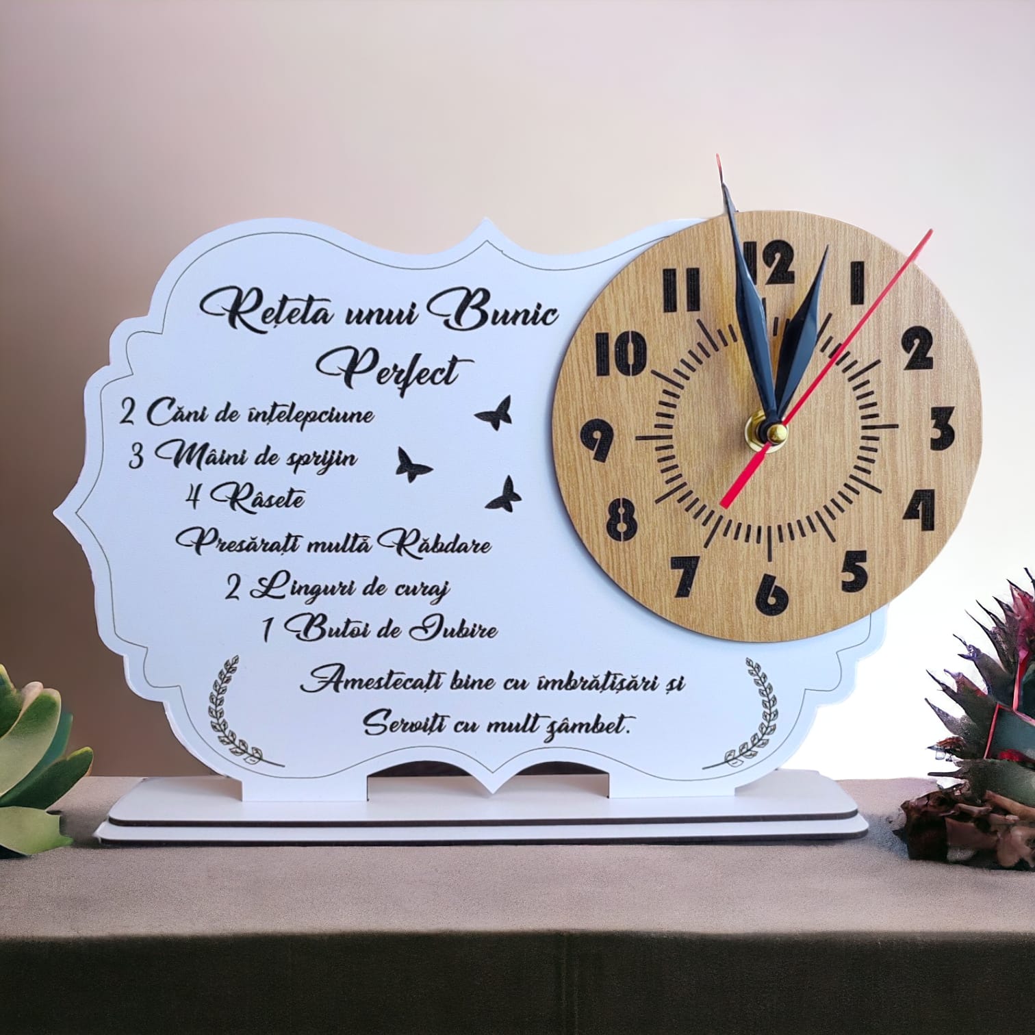 Mesajul standard este integrat armonios în designul ceasului, aducând o notă emoționantă și profundă, ce inspiră aprecierea pentru fiecare moment din viața noastră. De asemenea, Tabloul Ceas este complet personalizabil: poți adăuga nume, date importante sau un mesaj special pentru a-l transforma într-un cadou cu adevărat unic și personalizat, ideal pentru aniversări, evenimente speciale sau pentru cei dragi.