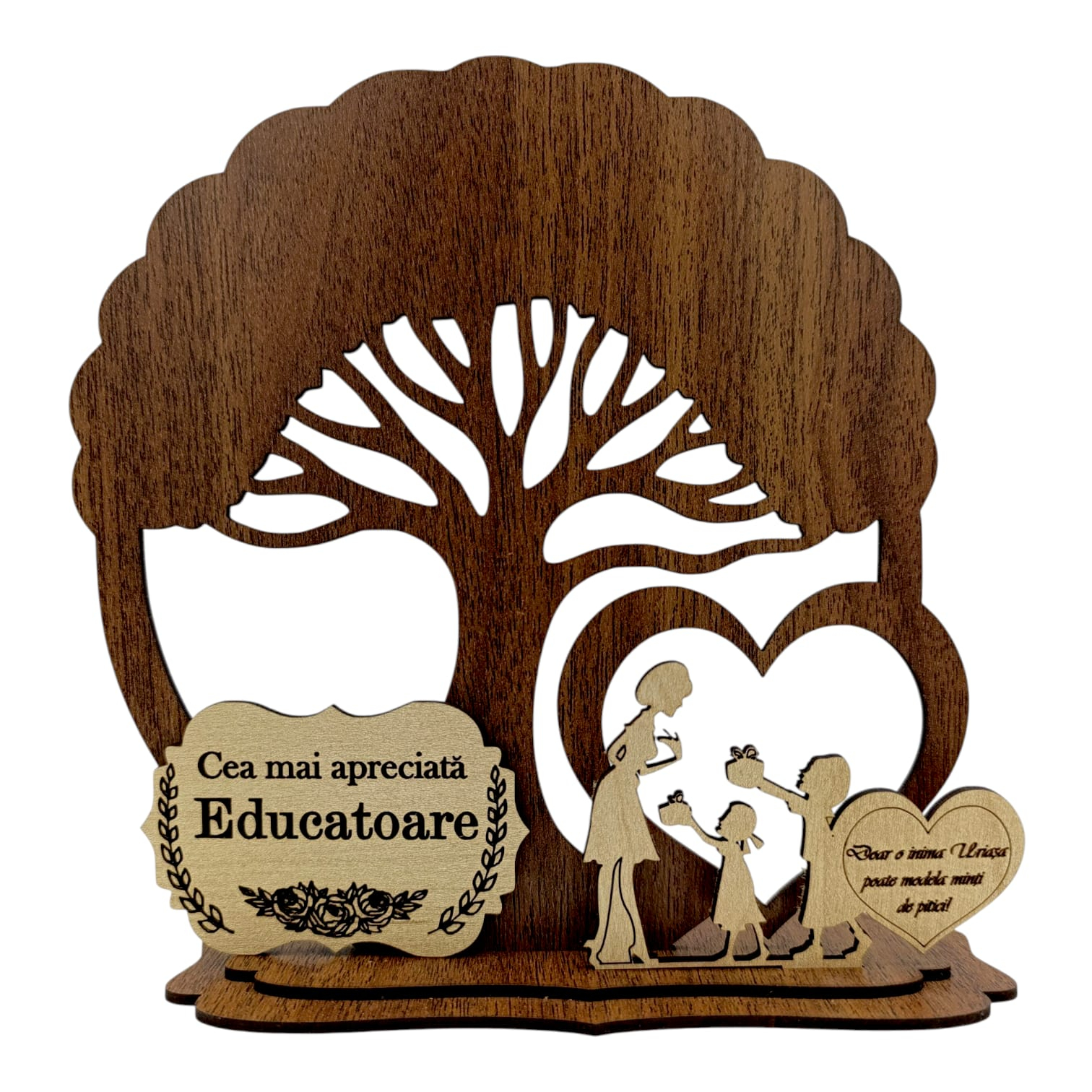 Realizată manual de Rustic Wood Decor în România, piesa îmbină eleganța lemnului natural cu un design simbolic al copacului vieții – reprezentând educația, creșterea și rădăcinile puternice pe care le sădesc dascălii.
