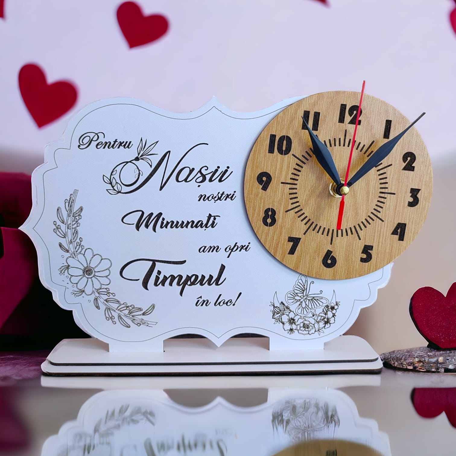 Decoratiune ceas de birou, cu mesaj personalizat standard, contine mecanismul de ceas complet . Dimensiuni aproximative 30x20cm.