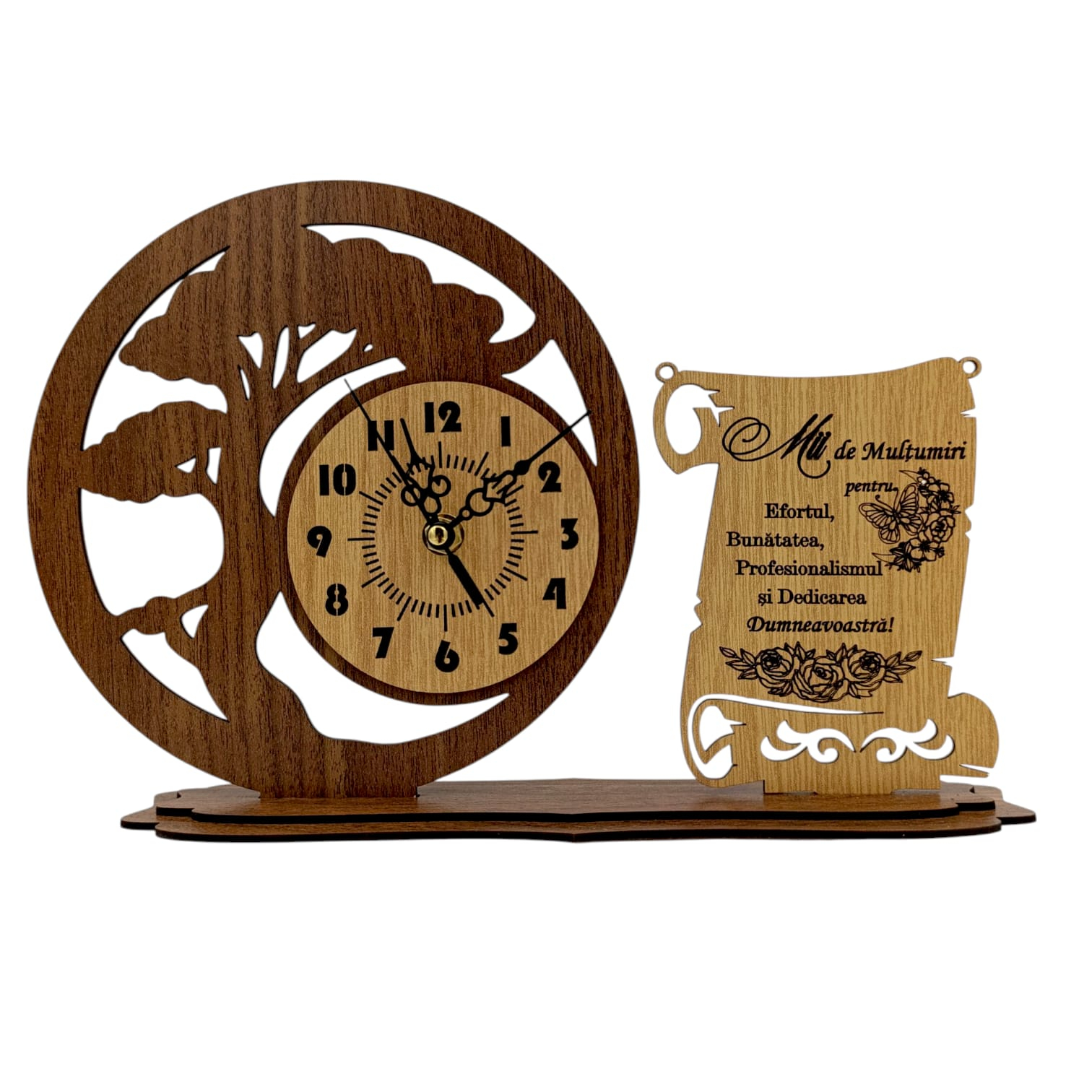 Cu o dimensiune de 30x20 cm, ceasul combină rafinamentul lemnului natural cu un mesaj plin de emoție, exprimând respectul și mulțumirea față de cei care au dăruit educație, răbdare și înțelepciune.