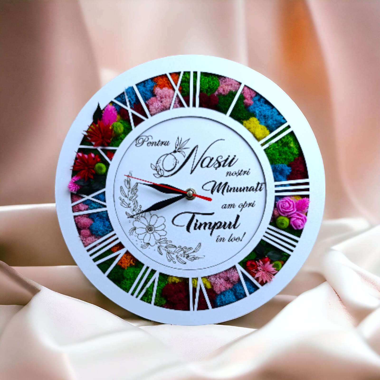 Ceas de perete, caseta decorata cu licheni naturali stabilizati, cadou personalizat pentru nasi, "Pentru Nasii nostri Minunati....!" alb