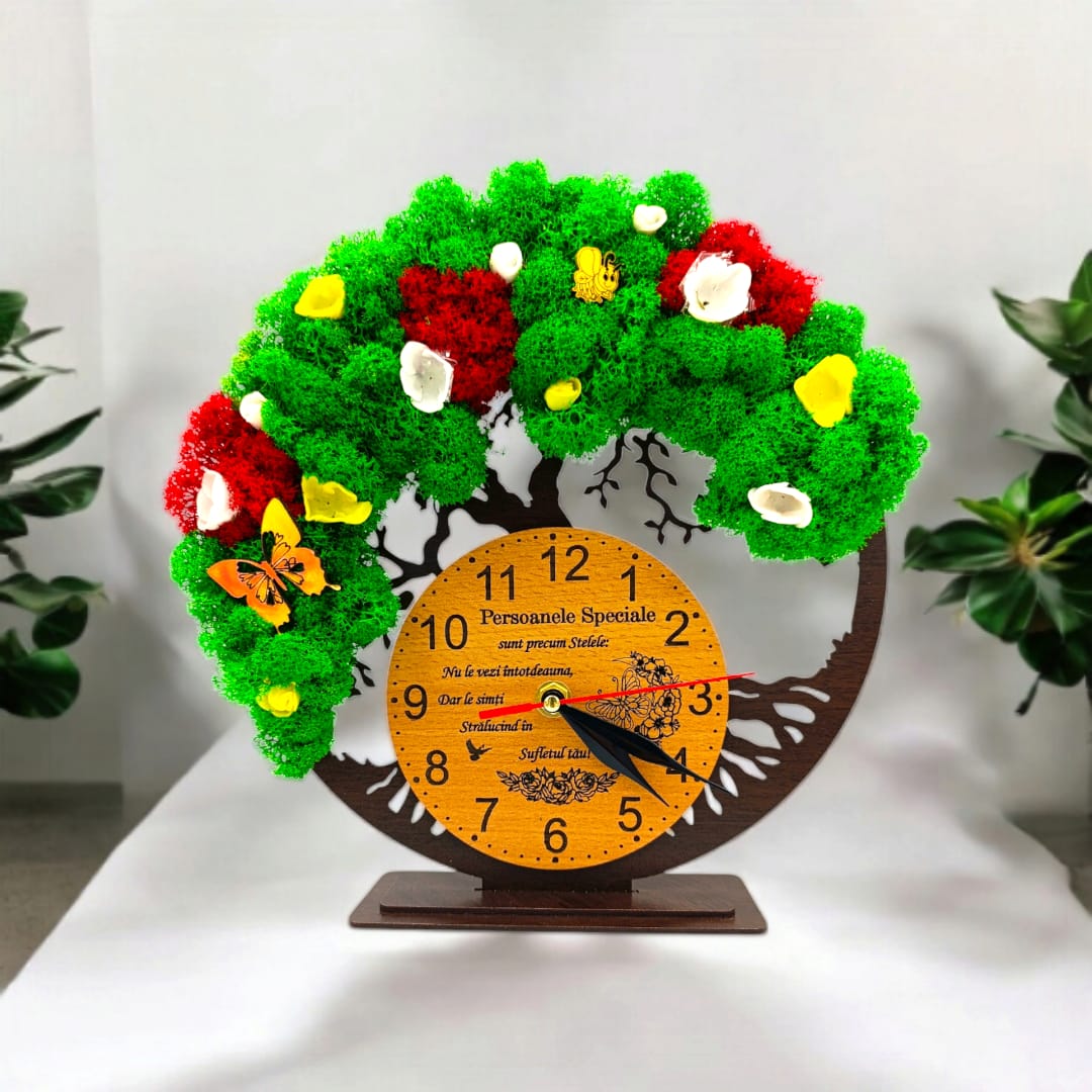 Cadou personalizat, Ceas decorativ copacul vietii cu mesaj standard pentru Persoanele Speciale, decorat cu licheni stabilizati si flori decorative naturale, wenge