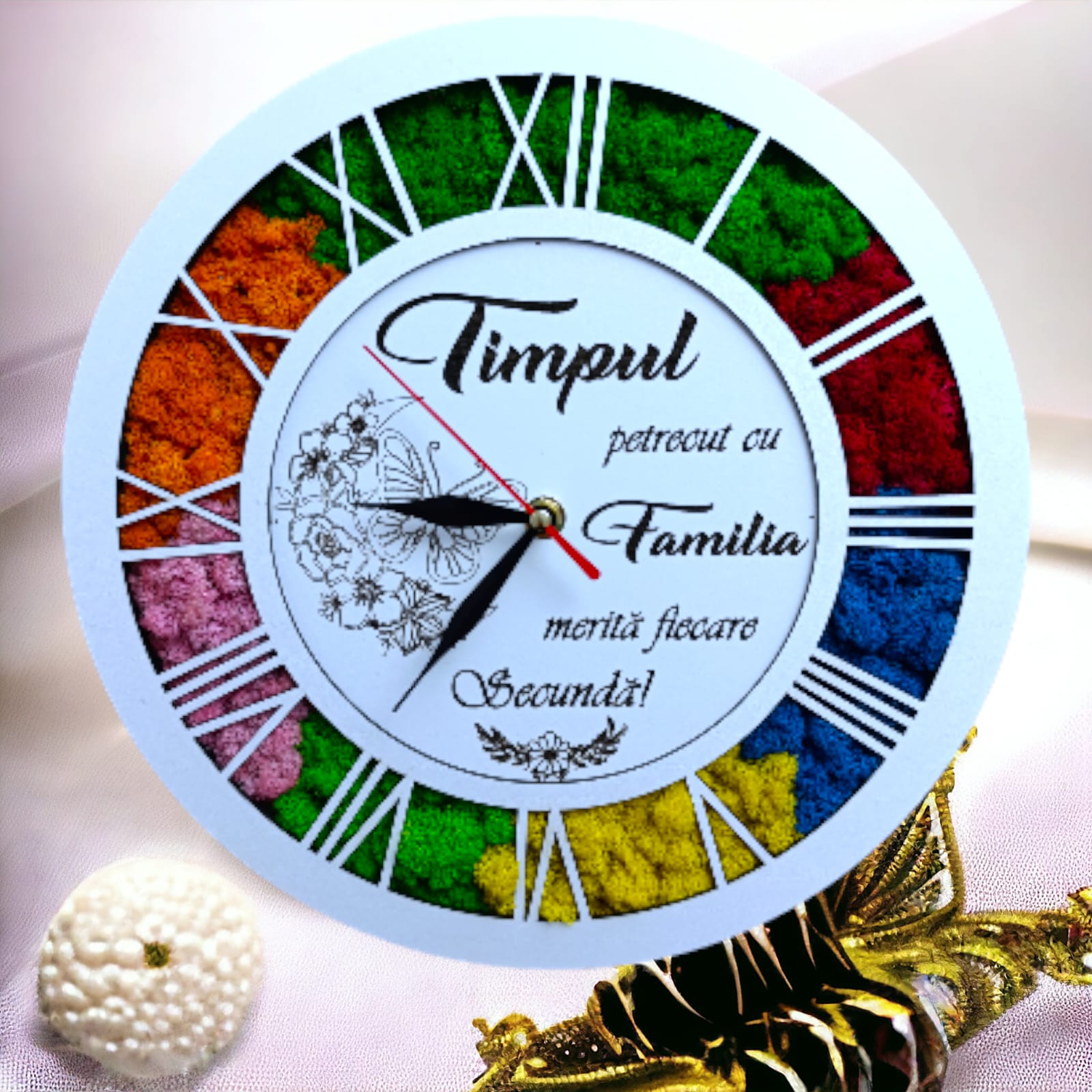 Ceas de perete stil caseta decorata cu licheni naturali stabilizati, cadou personalizat, "Timpul petrecut cu familia", alb