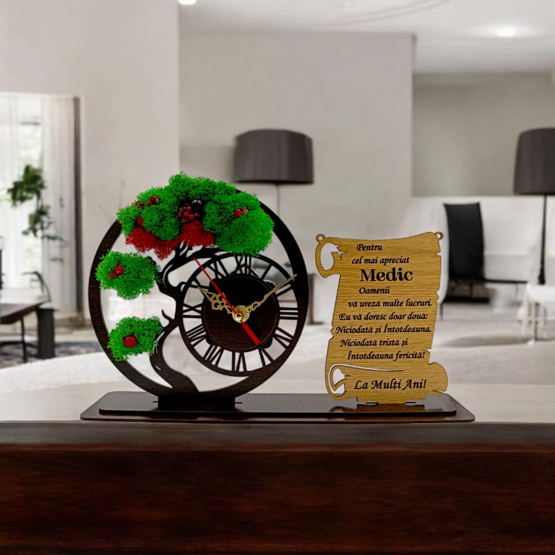 Ceas Bonsai cu Placută, personalizat pentru Medic "Pentru cel mai apreciat Medic", Produs în România de Rustic Wood Decor ,dimensiune 30x18cm