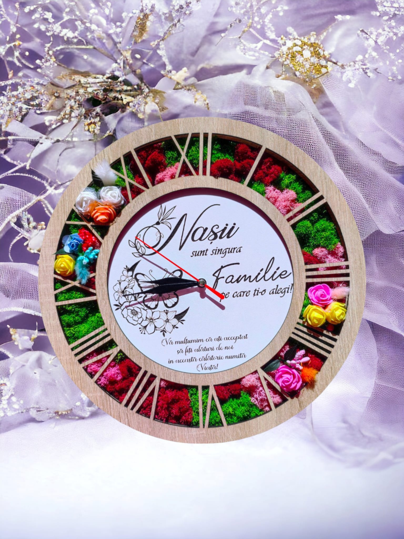 Ceas de perete stil caseta decorata cu licheni naturali stabilizati, cadou personalizat, "Nasii sunt singura familie pe care ti-o alegi!", cadran alb, sonoma stejar, model 4