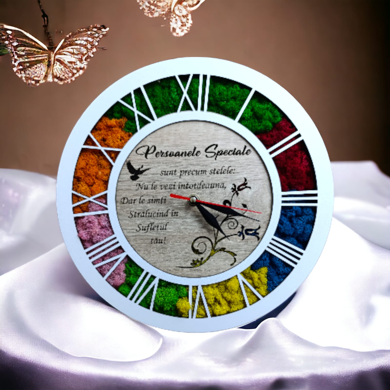 Ceas de perete stil caseta decorata cu licheni naturali stabilizati, cadou personalizat, "Persoanele speciale", cadran maro, Alb