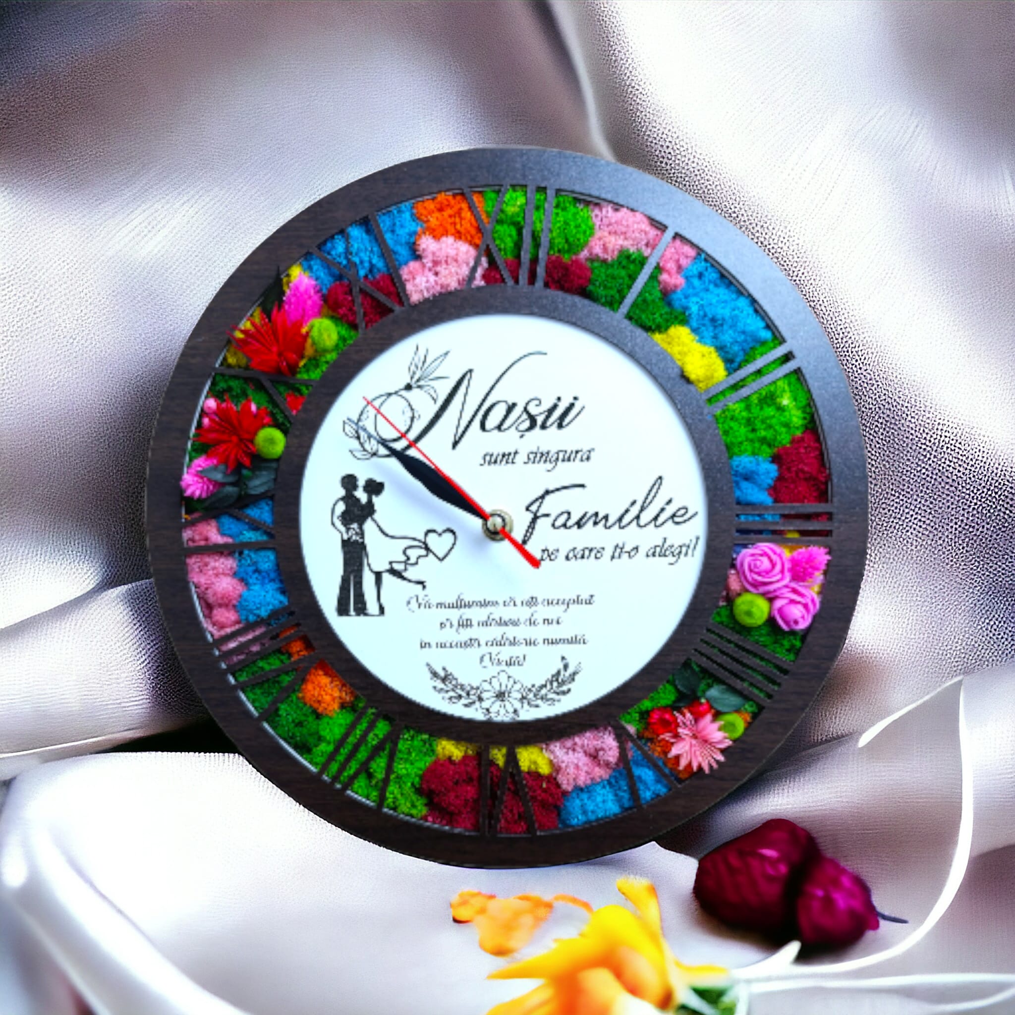Ceas de perete tip caseta decorata cu licheni naturali stabilizati, cadou personalizat "Nasii sunt singura familie", cadran alb, wenge
