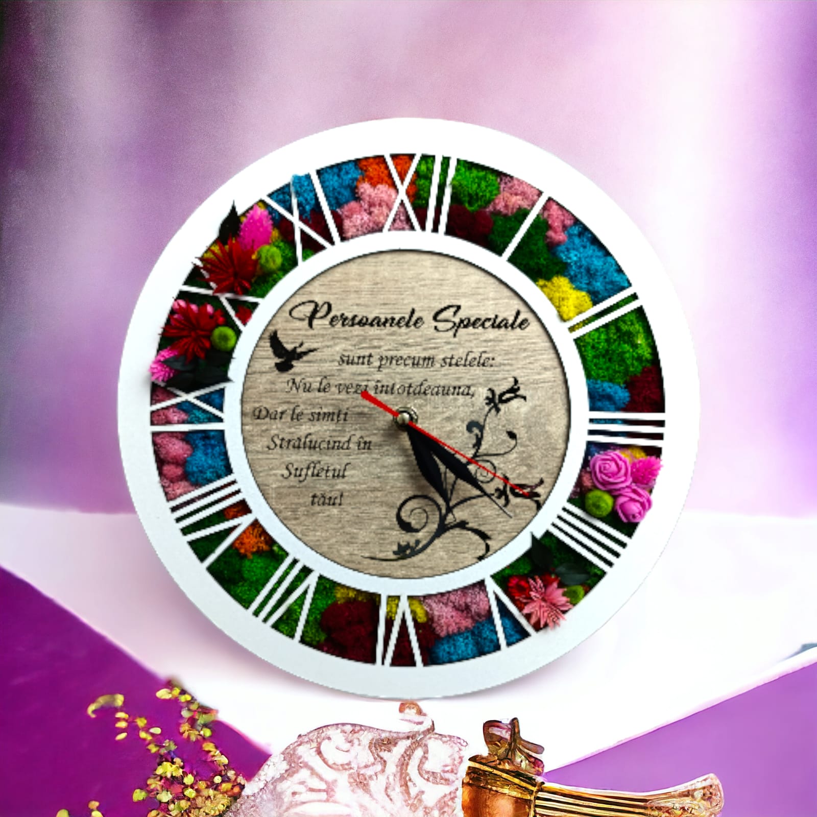 Ceas de perete, caseta decorata cu licheni naturali stabilizati, cadou personalizat "Persoanele speciale", cadran maro, Alb