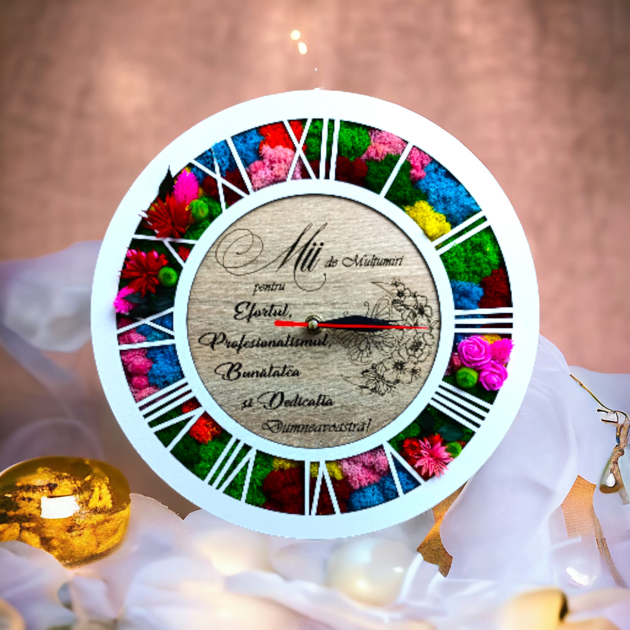 Ceas de perete, caseta decorata cu licheni naturali stabilizati, cadou personalizat "Mii de multumiri", cadran maro
