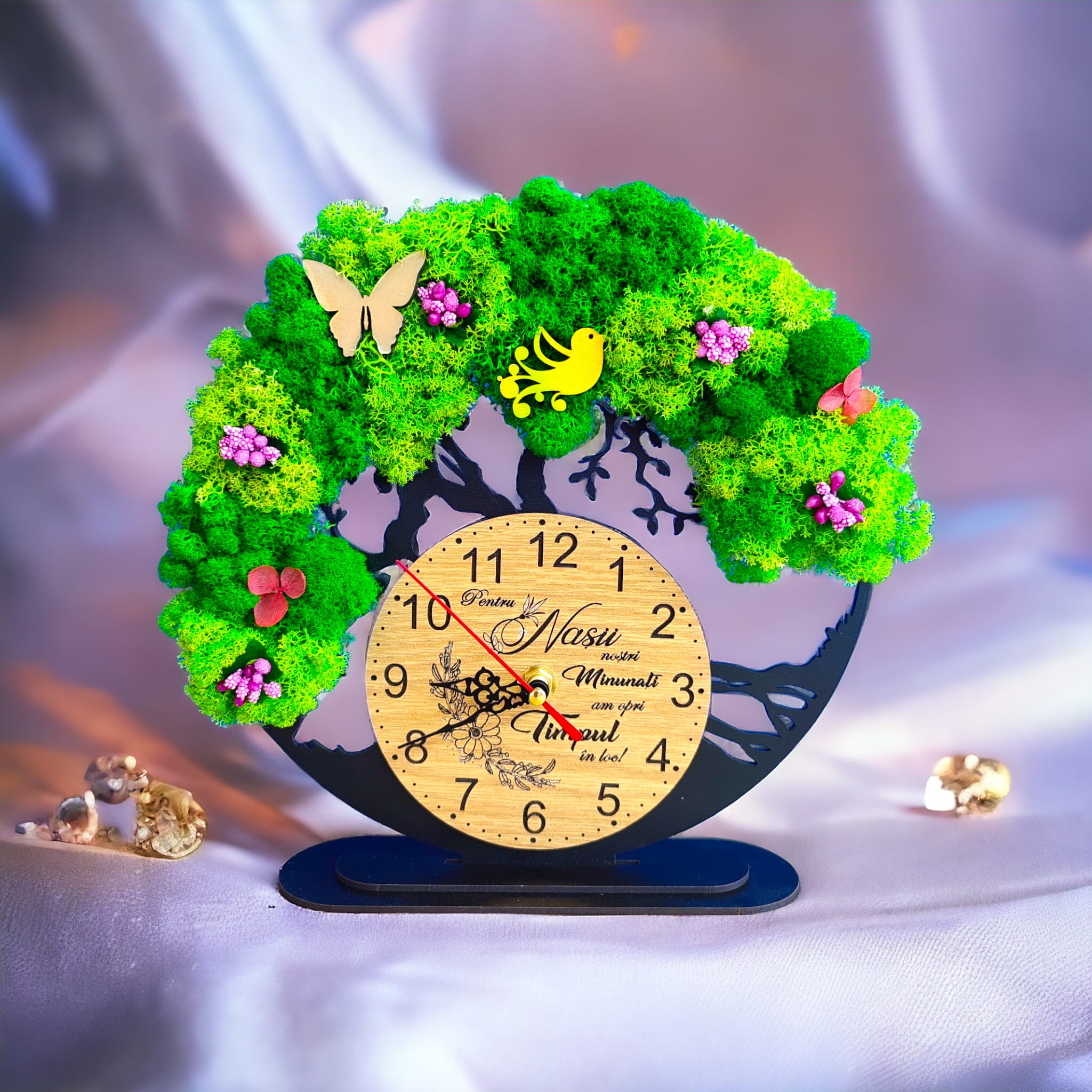 Ceas decorativ copacul vietii, personalizat cu mesaj standard pentru nasi, decorat cu licheni stabilizati si flori decorative naturale, negru, 25cm
