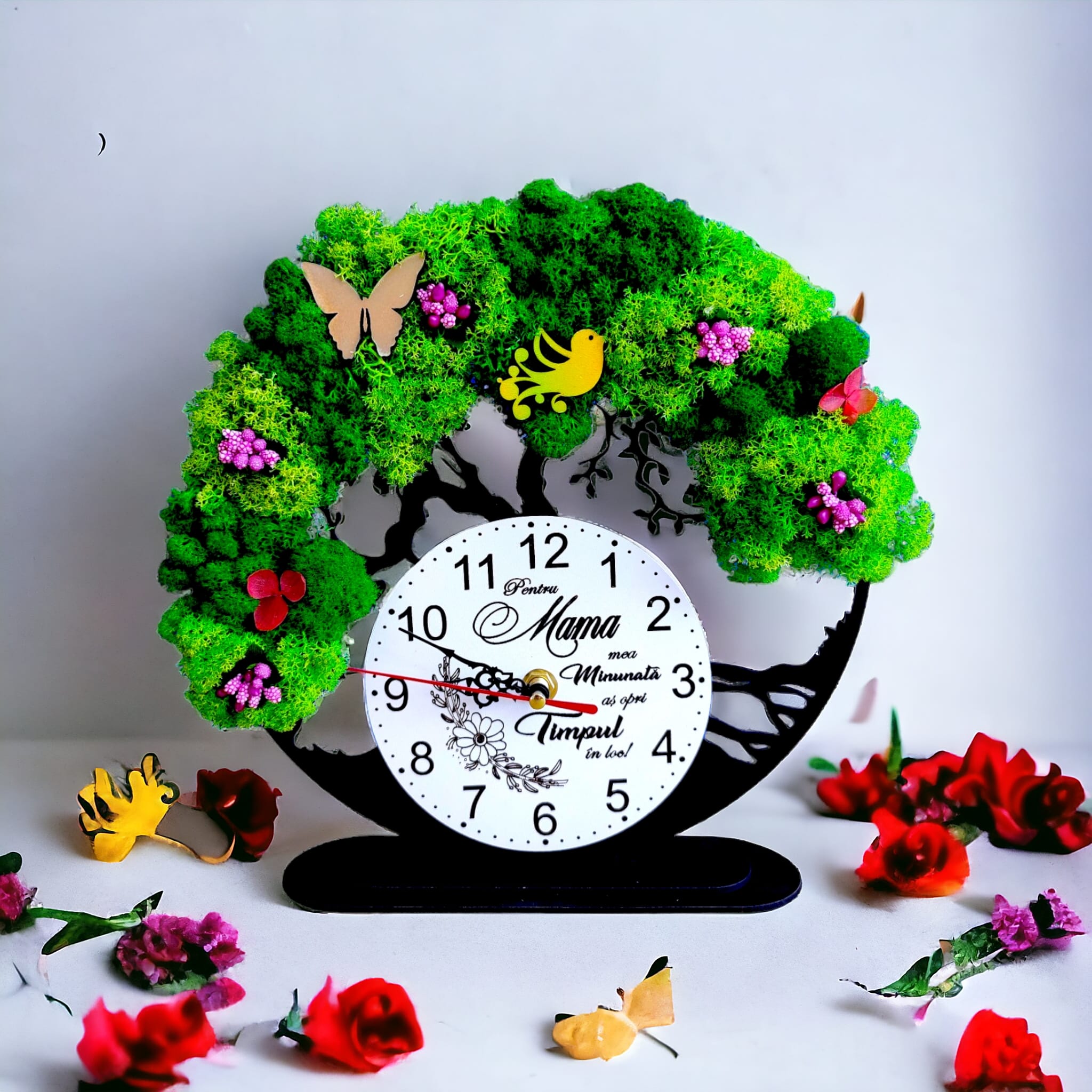Ceas decorativ copacul vietii, personalizat cu mesaj standard pentru Mama, decorat cu licheni stabilizati si flori decorative naturale, negru, 25cm