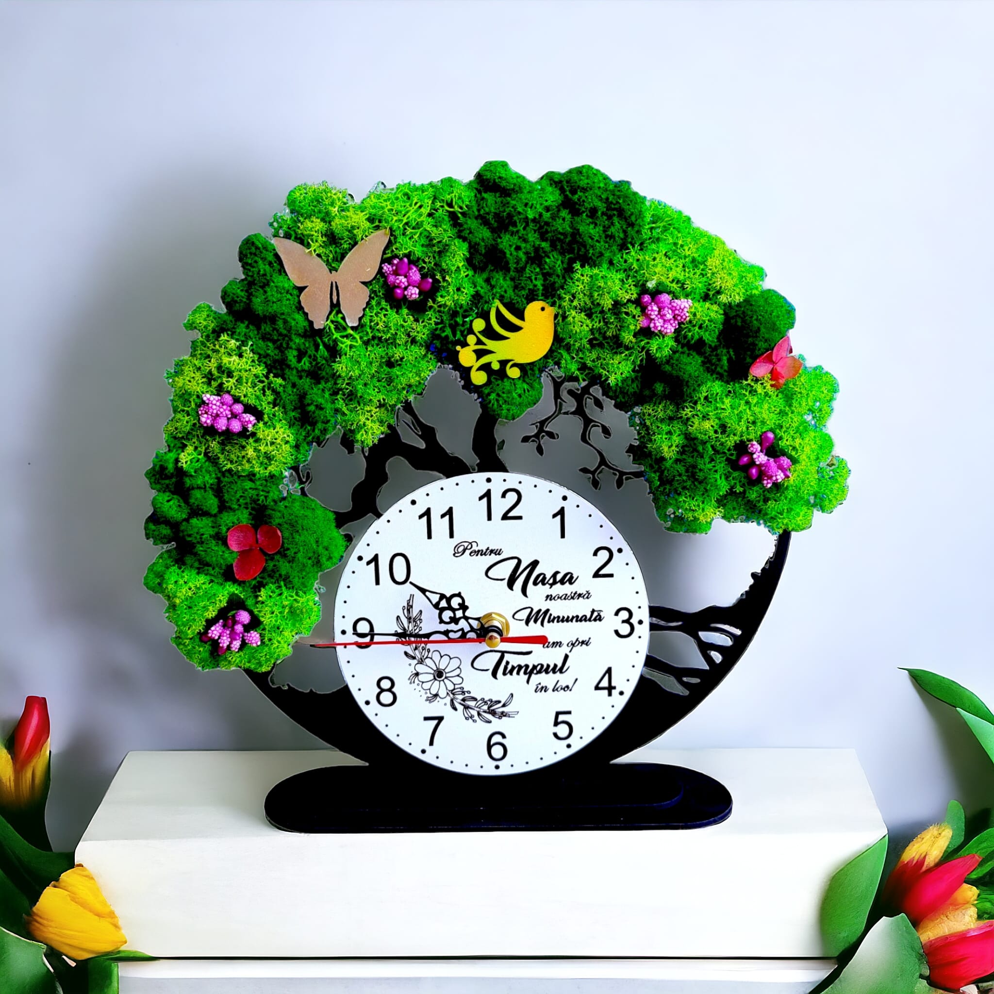 Ceas decorativ copacul vietii, personalizat cu mesaj standard pentru Nasa, decorat cu licheni stabilizati si flori decorative naturale, negru, 25cm