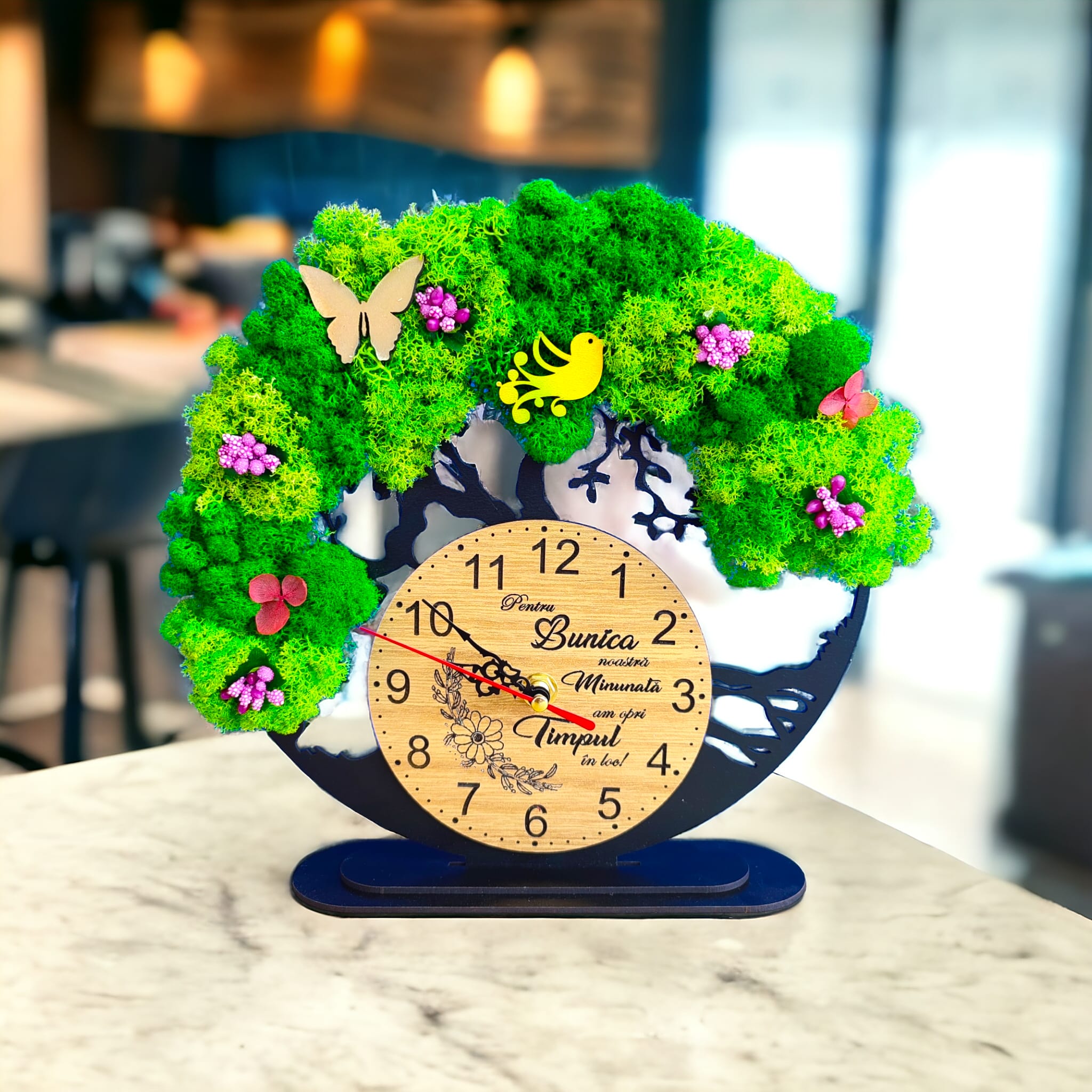 Ceas decorativ copacul vietii, personalizat cu mesaj standard pentru Bunica, decorat cu licheni stabilizati si flori decorative naturale, negru, 25cm - Copie