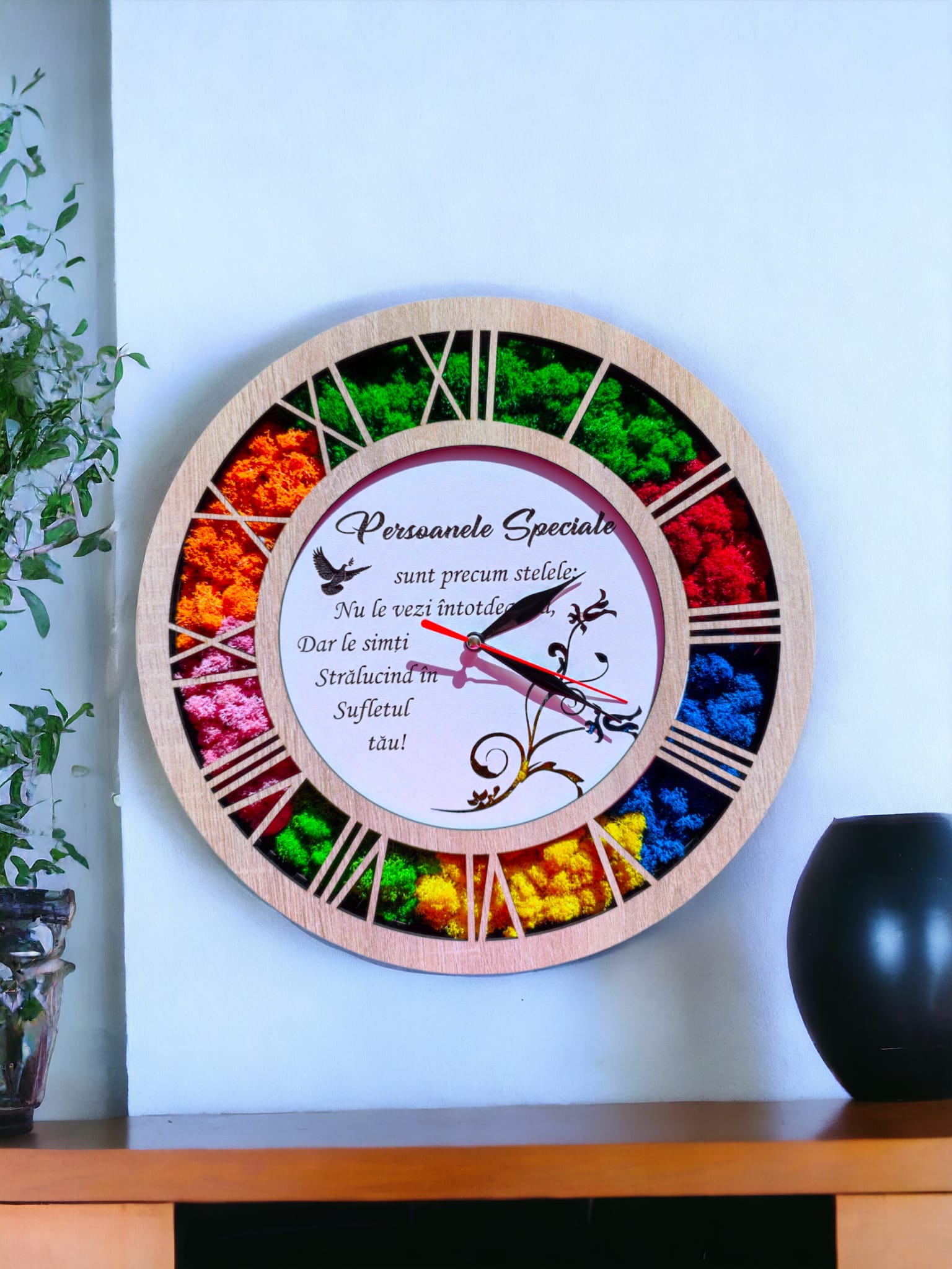 Ceas de perete tip caseta decorata cu licheni naturali stabilizati, cadou personalizat, "Persoanele speciale", cadran alb, sonoma stejar