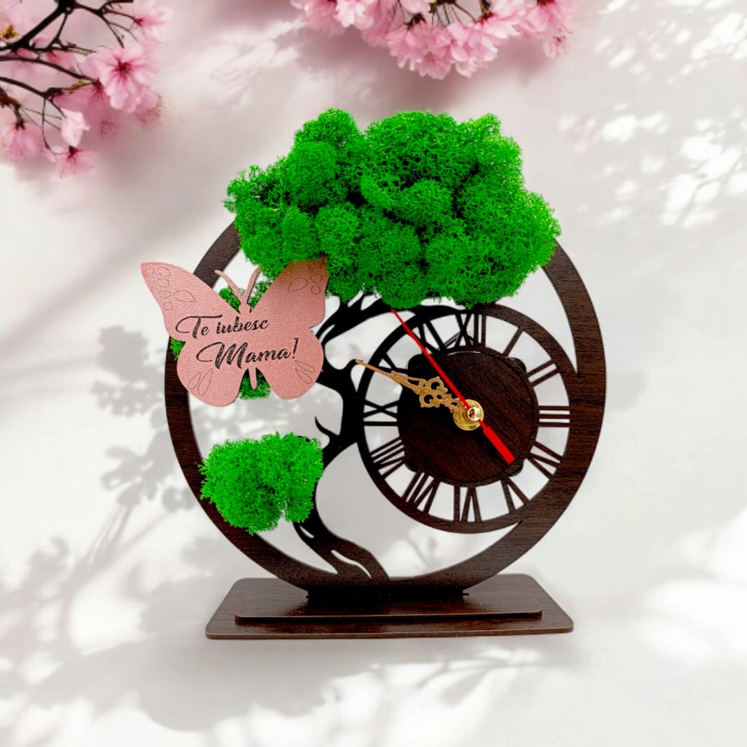 Ceas stil Bonsai cu licheni naturali, cadou personalizat cu mesaj standard fluture pentru Mamă "Te iubesc Mamă!" Produs în România de Rustic Wood Decor