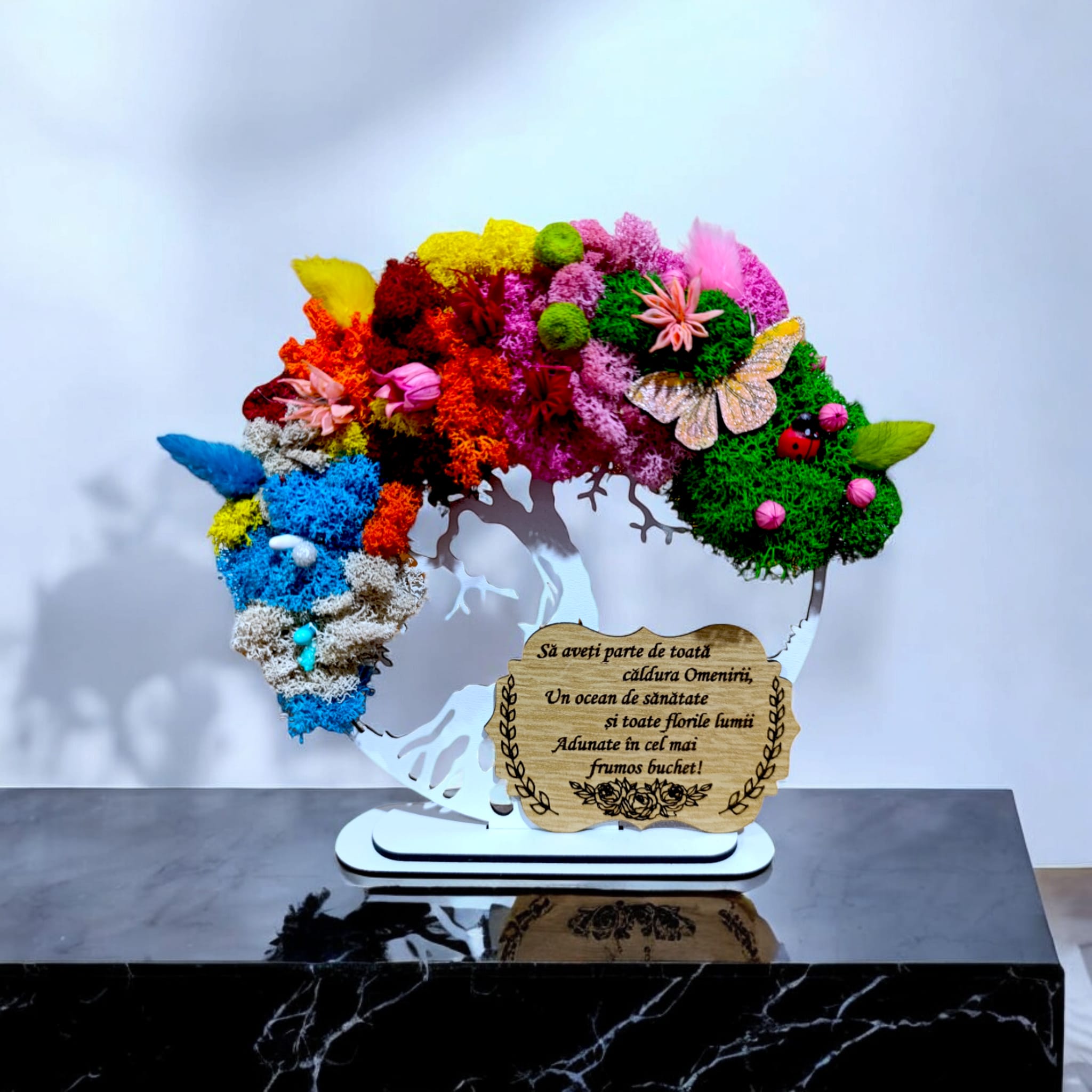 Tablou copacul vietii personalizat cu mesaj standard pentru profesoara, învatatoarea, persoane speciale, cadou decorat cu licheni stabilizati, 4 anotimpuri