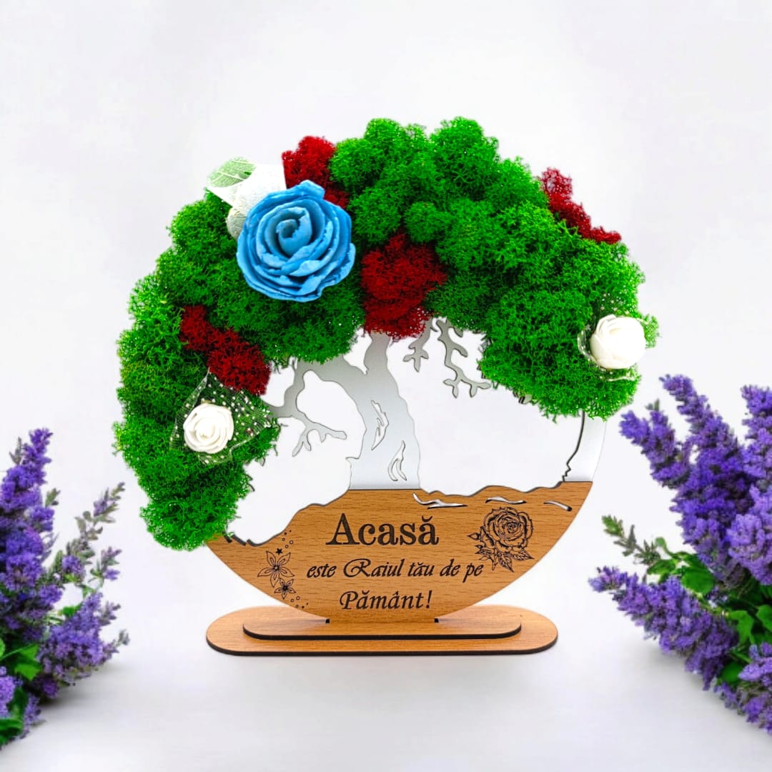 Tablou Copacul Vietii Cadou personalizat cu mesaj standard pentru Prieteni/Sotie/Fini/Familie/Nasi ”Acasa este Raiul..”, decorat cu licheni stabilizati Produs în România de Rustic Wood Decor