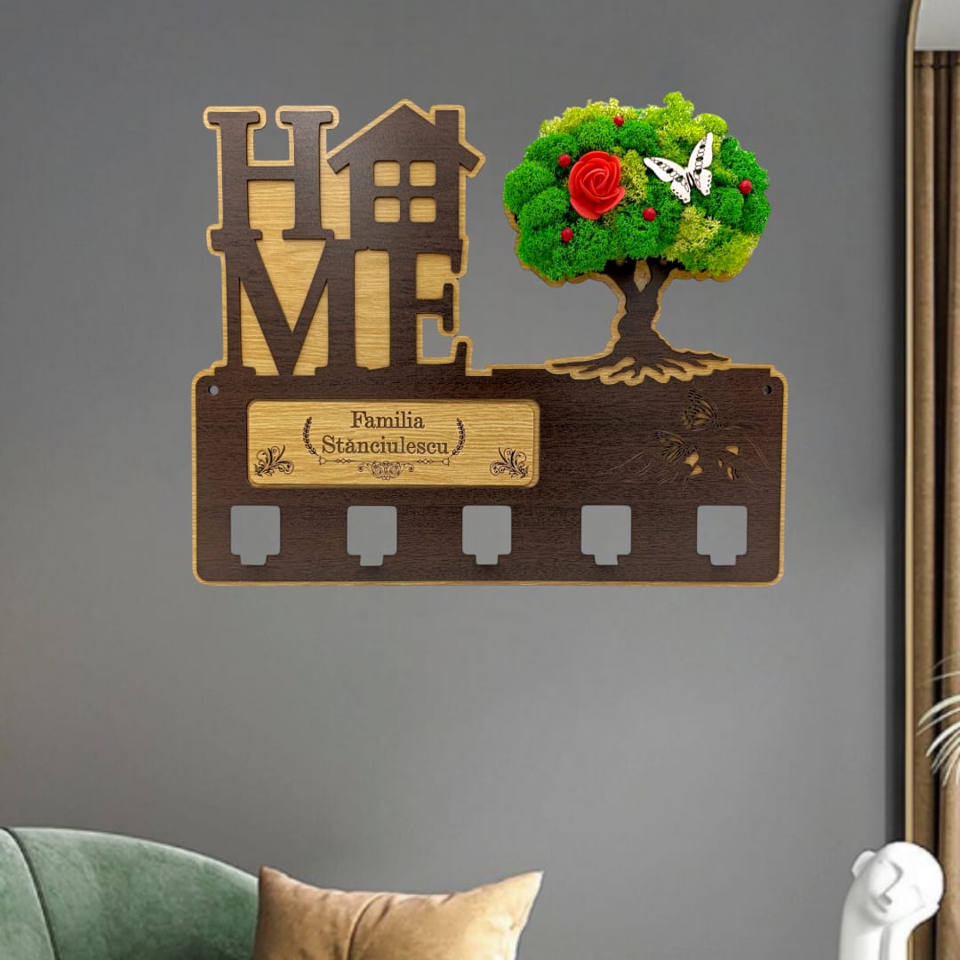 Cadou personalizat, cuier decorat cu licheni pe copac pentru perete cu mesaj standard "Numele Familiei" , 40x30cm