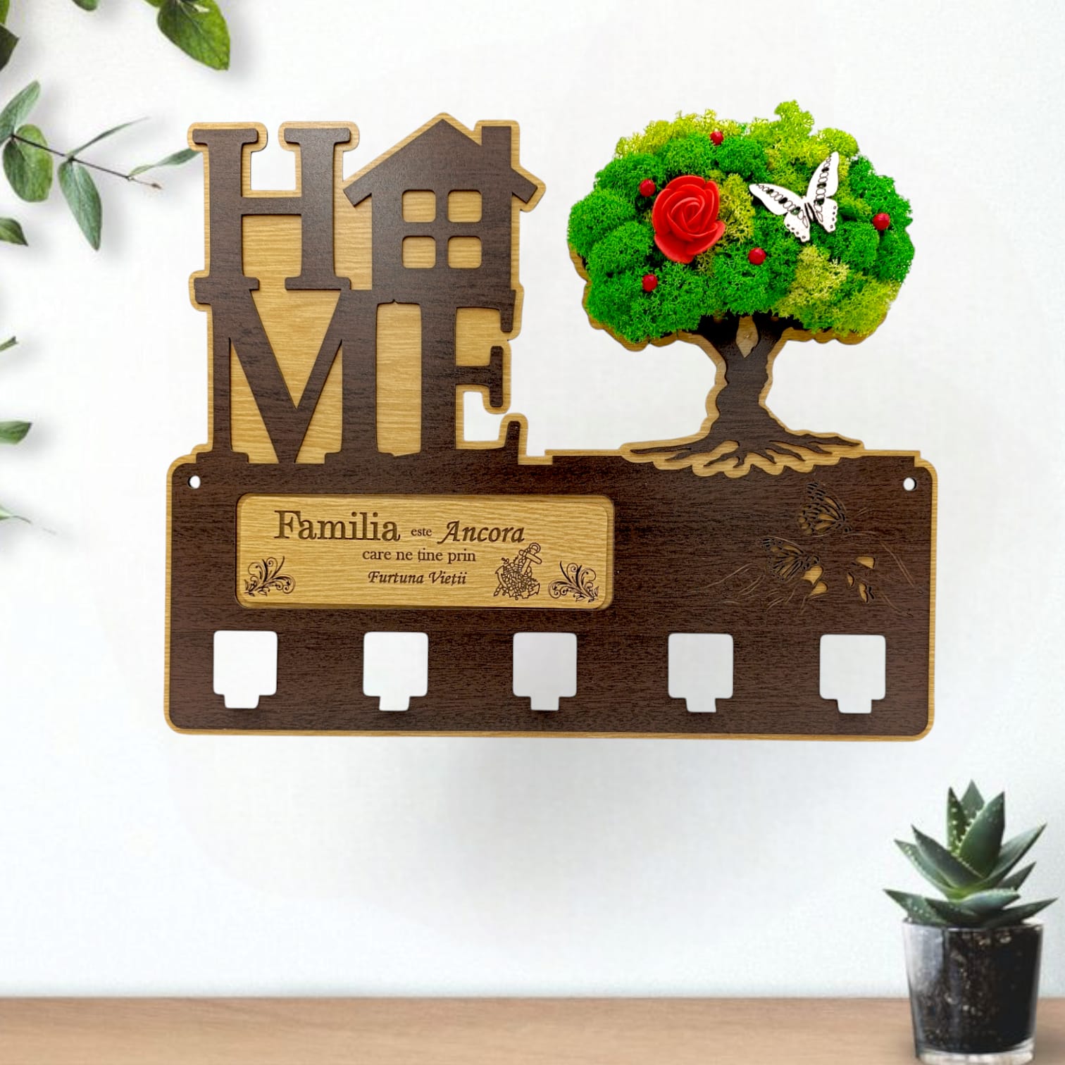 Cadou personalizat, cuier decorat cu licheni pe copac pentru perete cu mesaj standard "Familia este ancora, care ne tine in furtuna vietii!" , 40x30cm