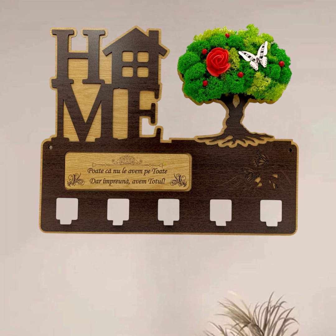Cadou personalizat, cuier decorat cu licheni pe copac pentru perete cu mesaj standard "Poate ca nu le avem pe toate, dar impreuna avem totul!" , 40x30cm