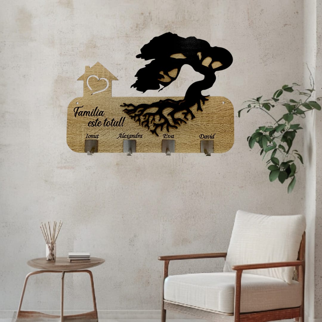 Cadou personalizat, cuier decorativ cu copac pentru perete cu mesaj standard "Familia este totul!"