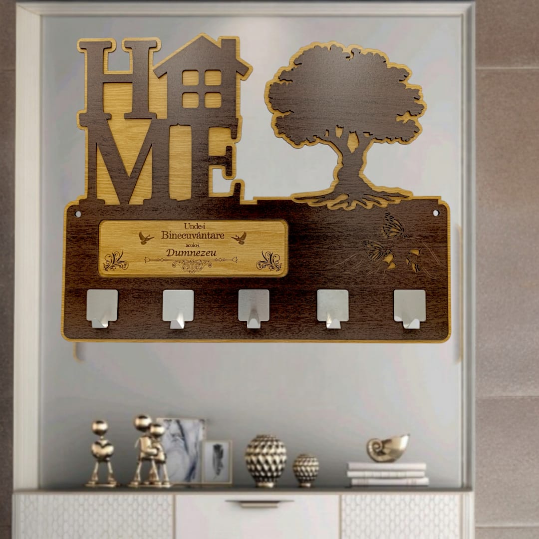 Cadou personalizat, blank cuier decorativ cu copac pentru perete cu mesaj standard "Unde-i Binecuvantare, acolo-i Dumnezeu!" , 40x30cm