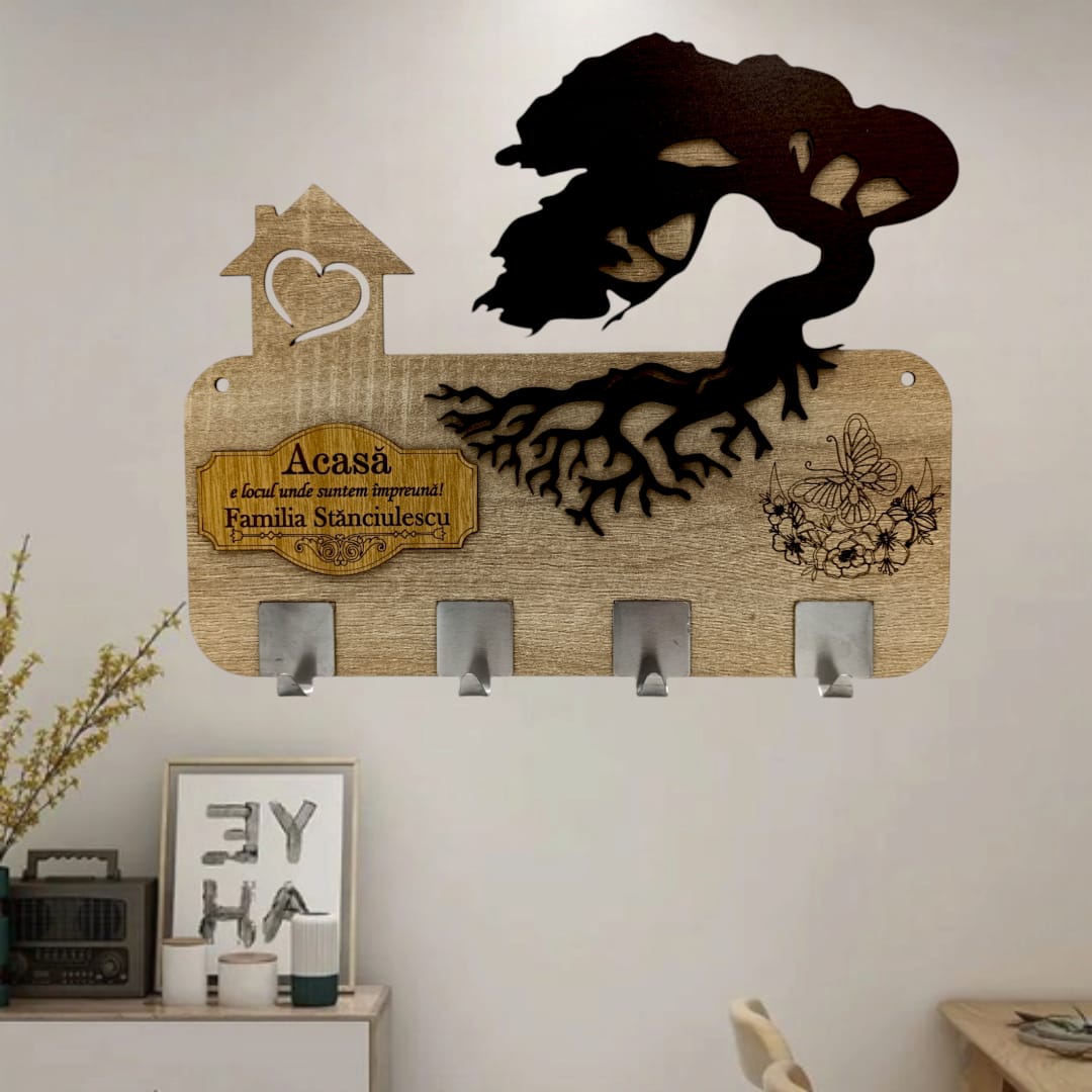 Cadou personalizat, blank cuier decorativ cu bonsai pentru perete cu mesaj standard "Acasa e locul unde suntem impreuna!"