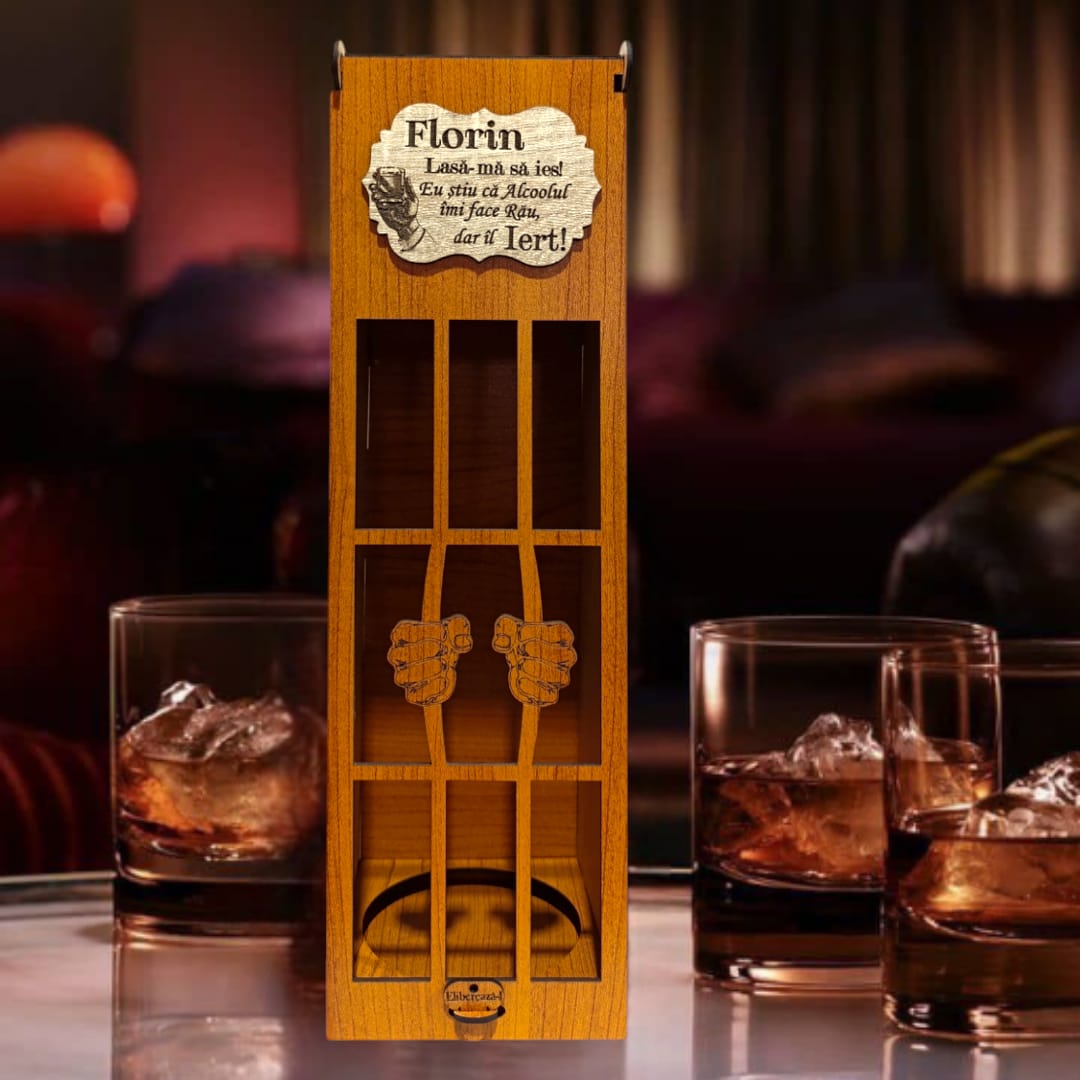 Cadou personalizat, Cutie de vin personalizata cu mesaj standard "Lasa-ma sa ies, eu stiu ca alcool-ul imi face rau dar il iert!", pentru prieteni, familie, dimensiune 35x10cm, maro