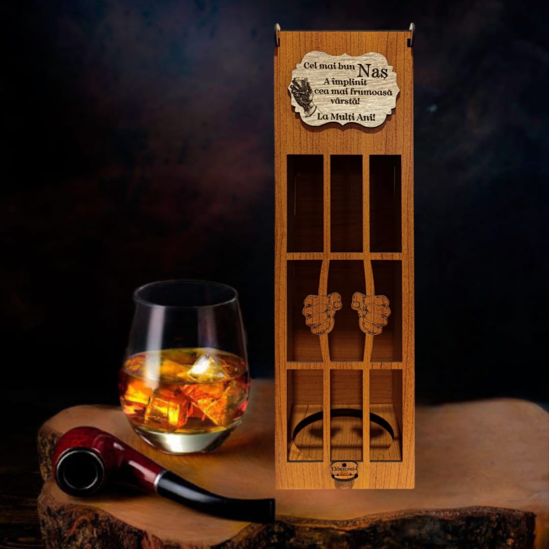 Cadou personalizat, Cutie de vin personalizata cu mesaj standard "Cel mai bun Nas, a implinit cea mai frumoasa varsta!", pentru prieteni, familie, dimensiune 35x10cm, maro