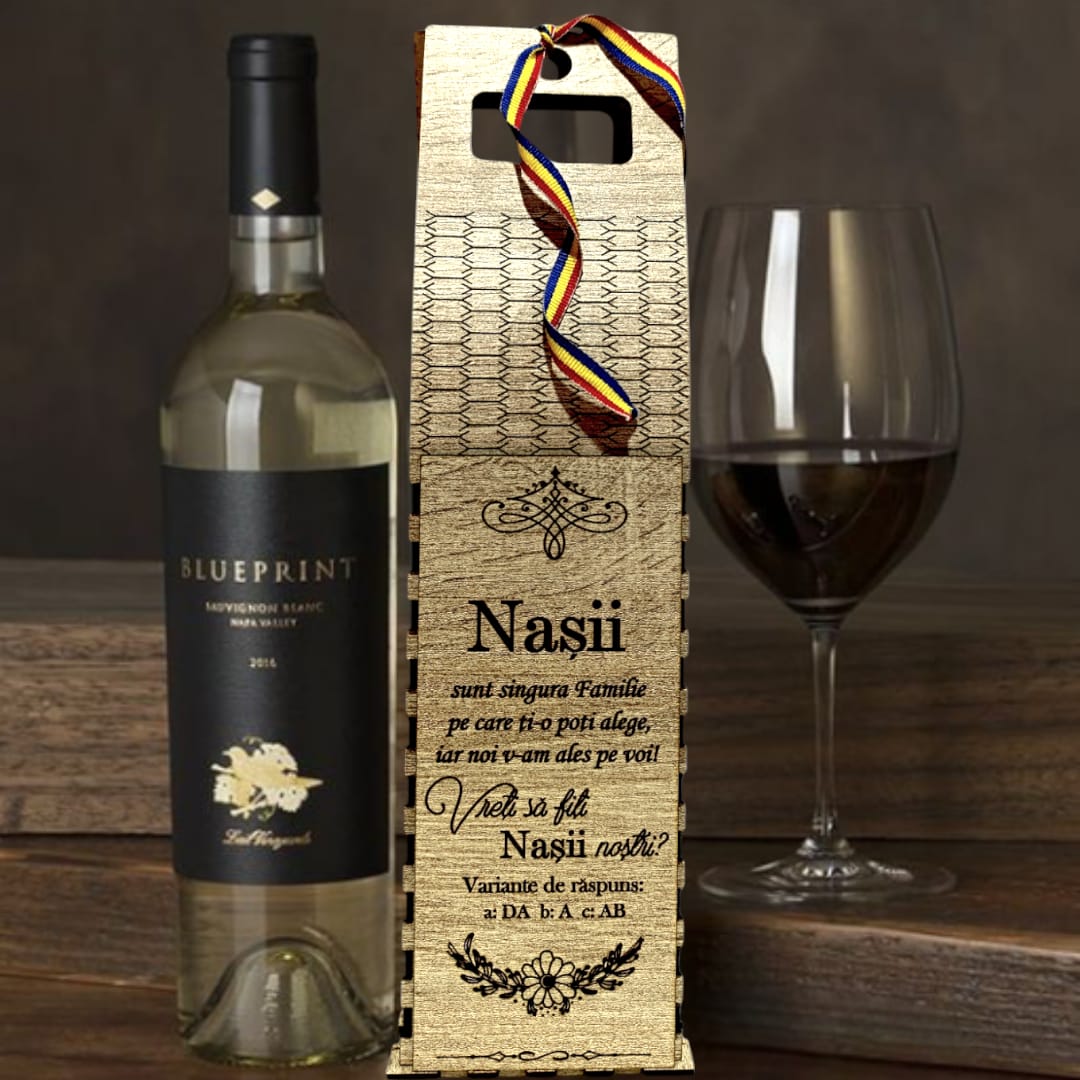 Cadou personalizat, Cutie din Lemn pentru Sticla de Vin - Cadou Elegant și Unic, personalizata pentru Nasi, 37x10cm
