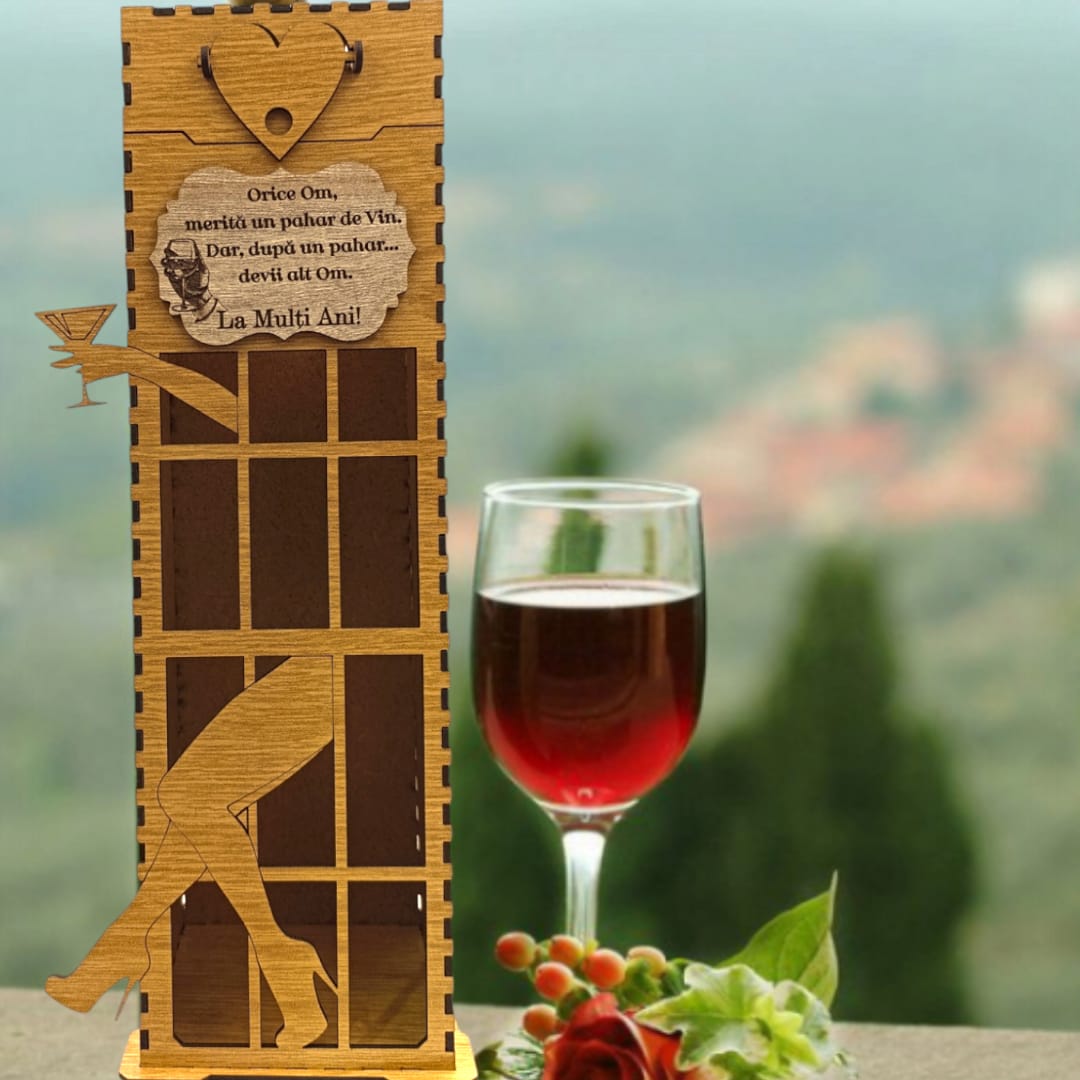Cadou personlizat, Cutie pentru Whisky/Vin cu nume si mesaj "Orice om, merita un pahar de vin...", maro, dimensiune 35x10cm