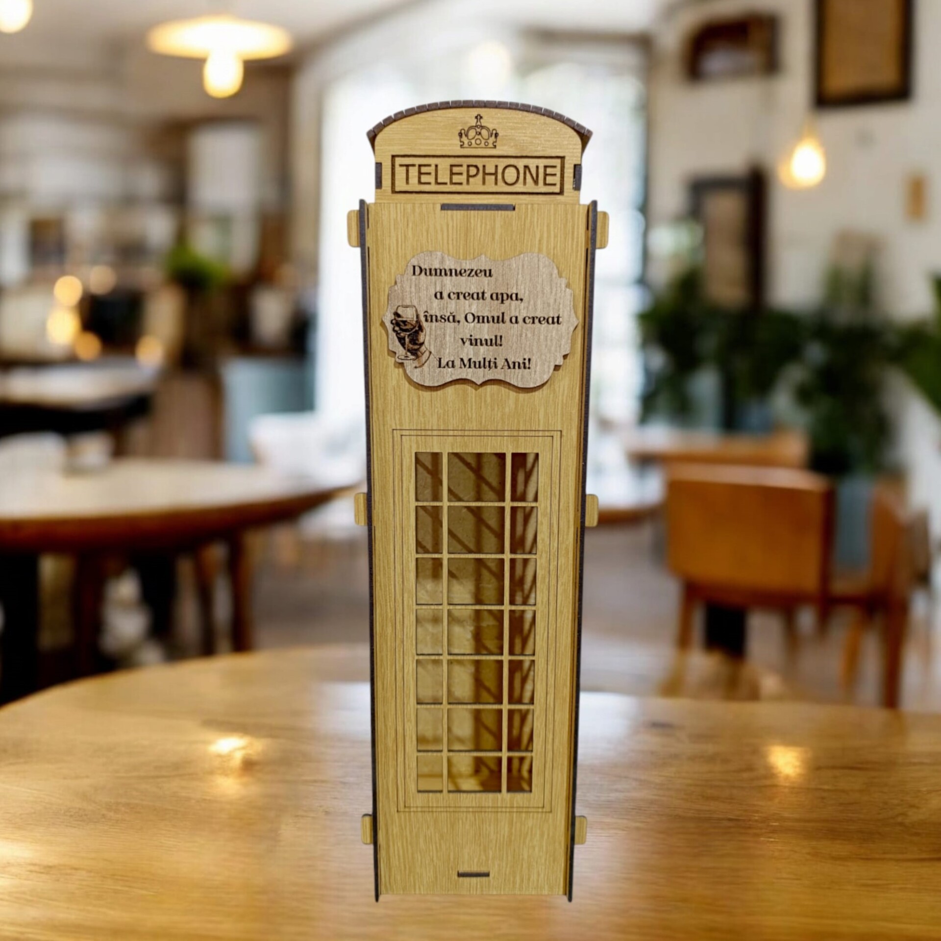 Oferă un cadou deosebit cu această cutie de vin personalizată, inspirată de designul clasic al unei cabine telefonice. Perfectă pentru prieteni, familie sau ocazii speciale, această cutie îmbină eleganța și funcționalitatea într-o prezentare unică: