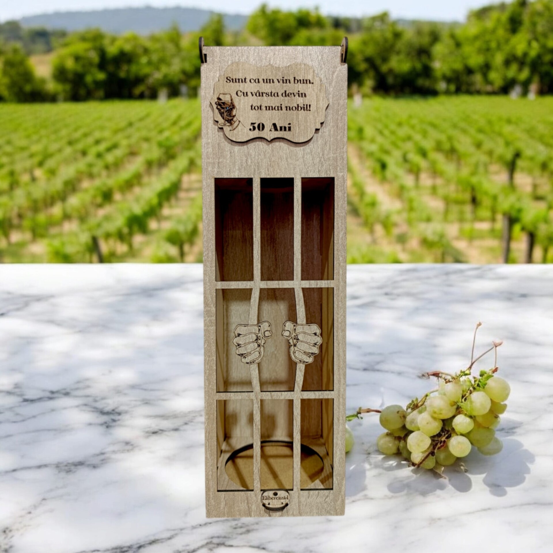 Cutie de vin personalizata cu mesaj standard, cadou personalizat pentru prieteni, familie– Produs în România de Rustic Wood Decor, model închisoare, dimensiune 35x10cm, crem sonoma