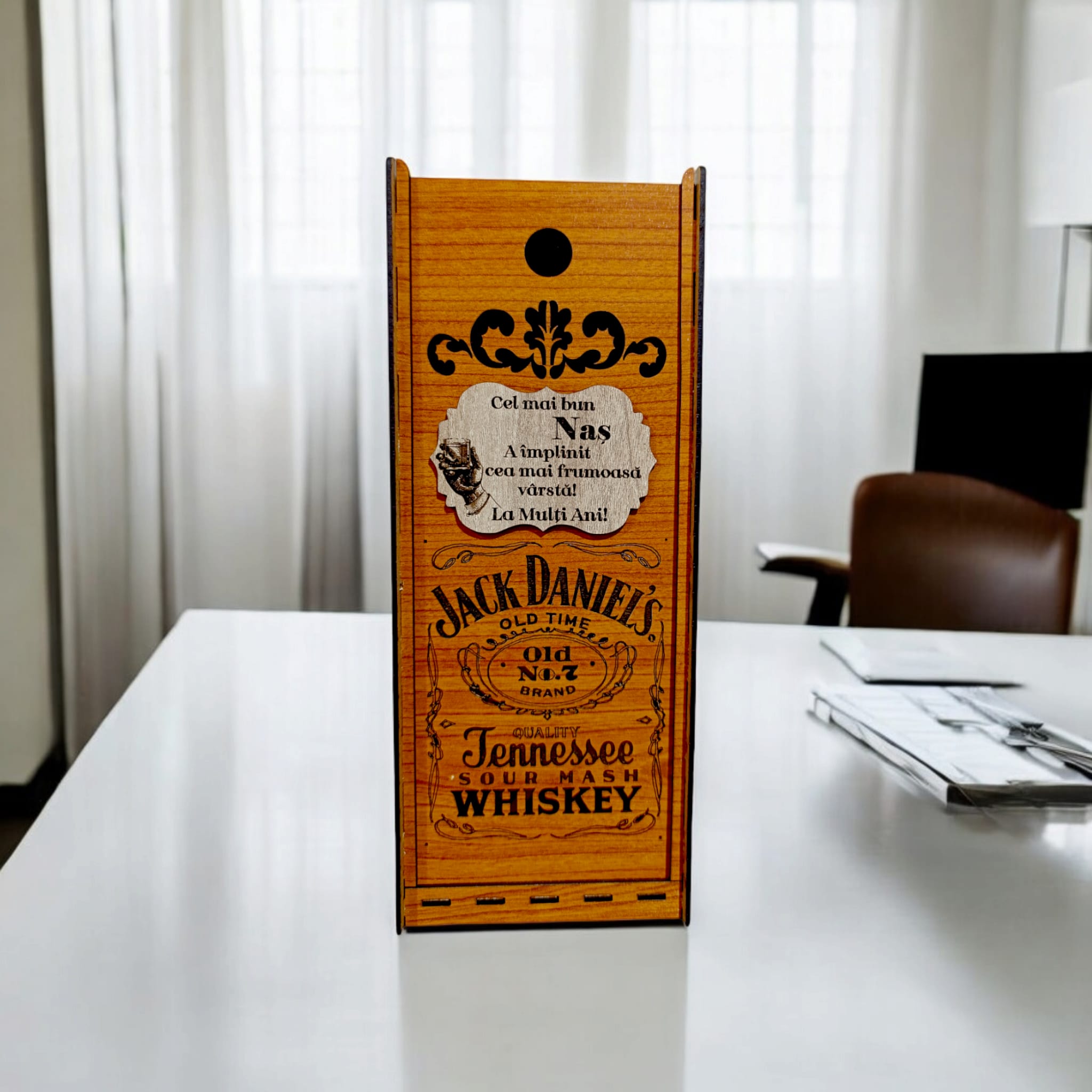 Cutie de whiskey personalizata cu mesaj standard, cadou personalizat pentru Nas– Produs în România de Rustic Wood Decor, model Jack Daniel's, dimensiune 35x10cm, culoare cires