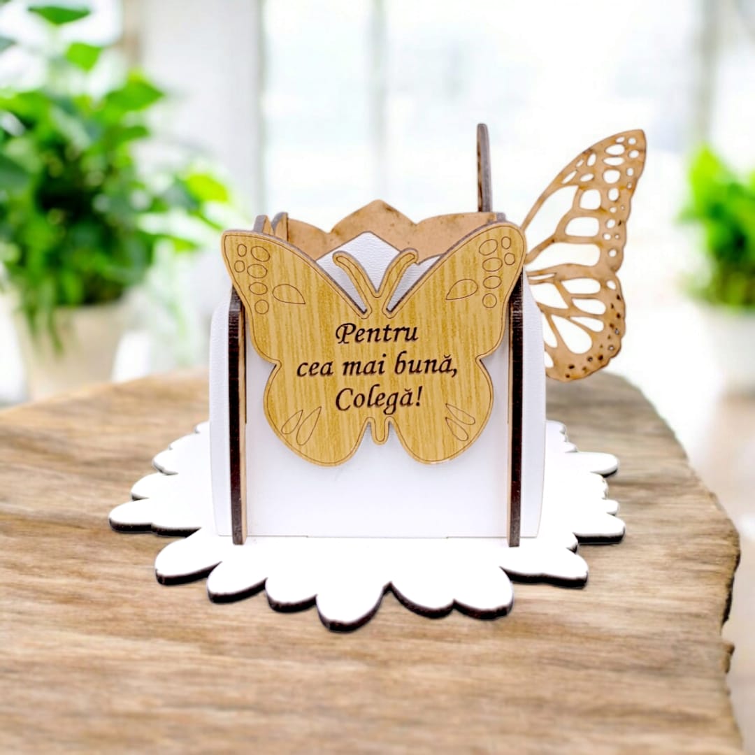 Cadou personalizat, Cutie tip martisor cu fluturi si mesaj standard pentru Colega, dimensiune 10x10, alb