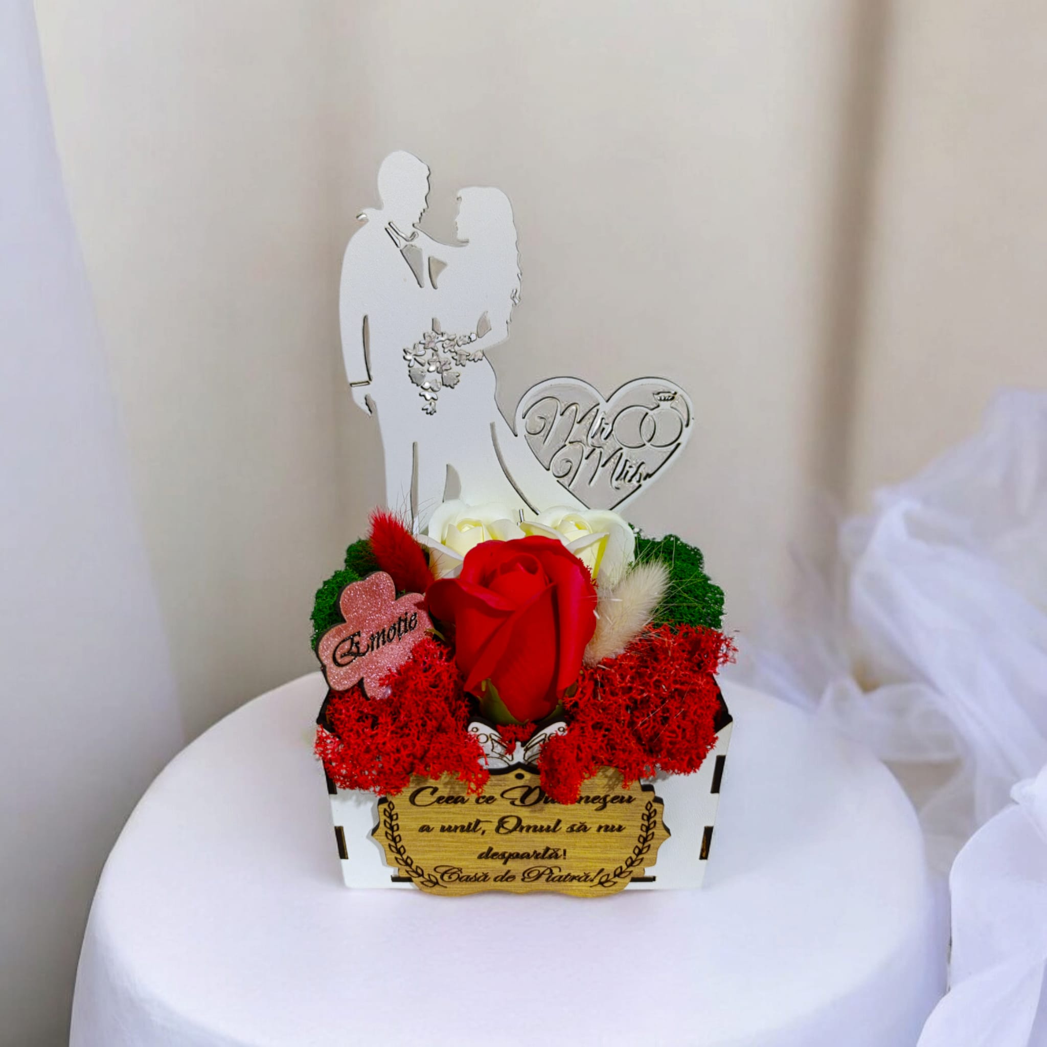 Cadou personalizat, cutie din lemn decorata cu licheni cu mesaj standard pentru Nunta/Sot/Sotie, dimensiune 18x12cm