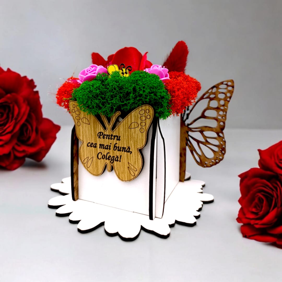 Cadou personalizat, cutie din lemn decorata cu licheni cu mesaj standard pentru Colega, dimensiune 7x7cm, alb
