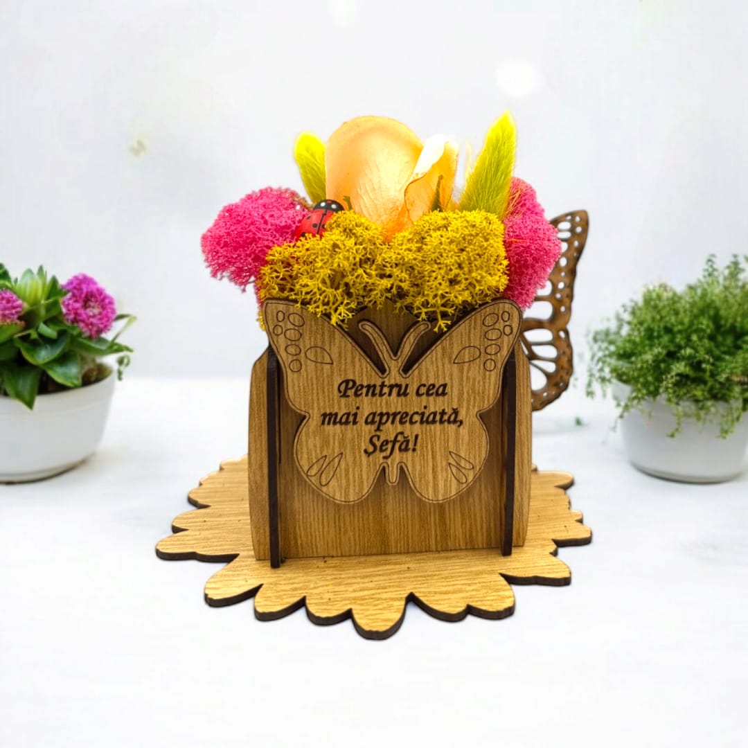 Cadou personalizat, cutie din lemn decorata cu licheni cu mesaj standard pentru Sefa, dimensiune 7x7cm, maro