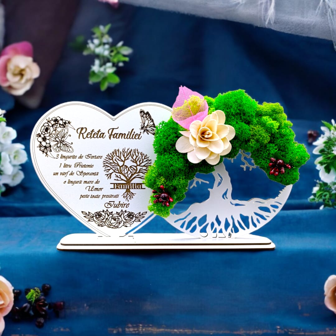 Tablou Inima Copacul vietii decorativ cu suport, personalizat "Reteta Familiei" , Produs în România de Rustic Wood Decor, dimensiune 30x16cm