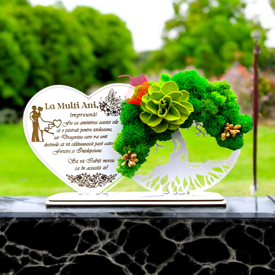 Tablou Inima Copacul vietii decorativ cu suport, personalizat pentru Nunta "La multi ani impreuna!..." , Produs în România de Rustic Wood Decor, dimensiune 30x16cm