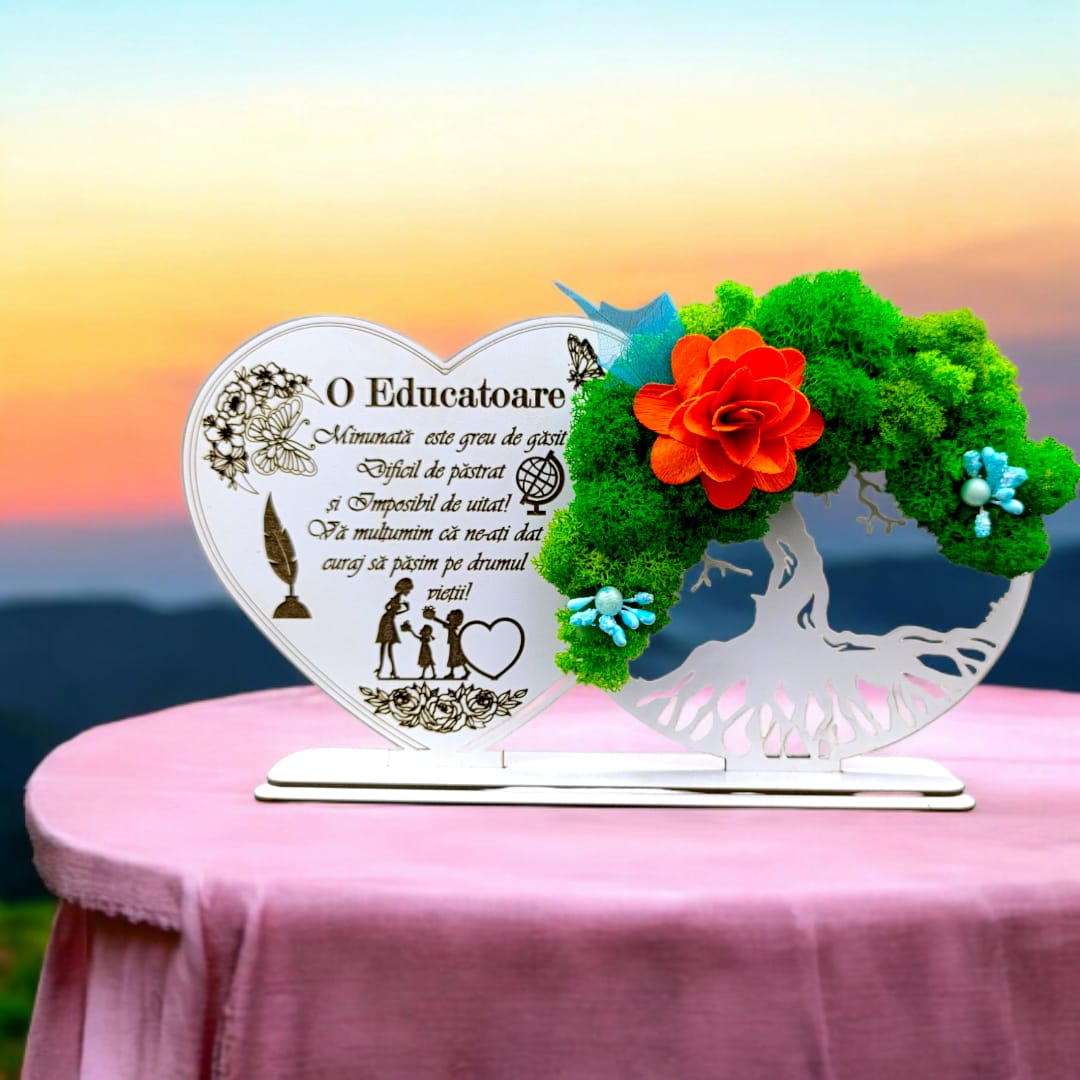 Tablou Inima Copacul vietii decorativ cu suport, personalizat pentru Educatoare "O Educatoare minunata este greu de gasit..." , Produs în România de Rustic Wood Decor, dimensiune 30x16cm