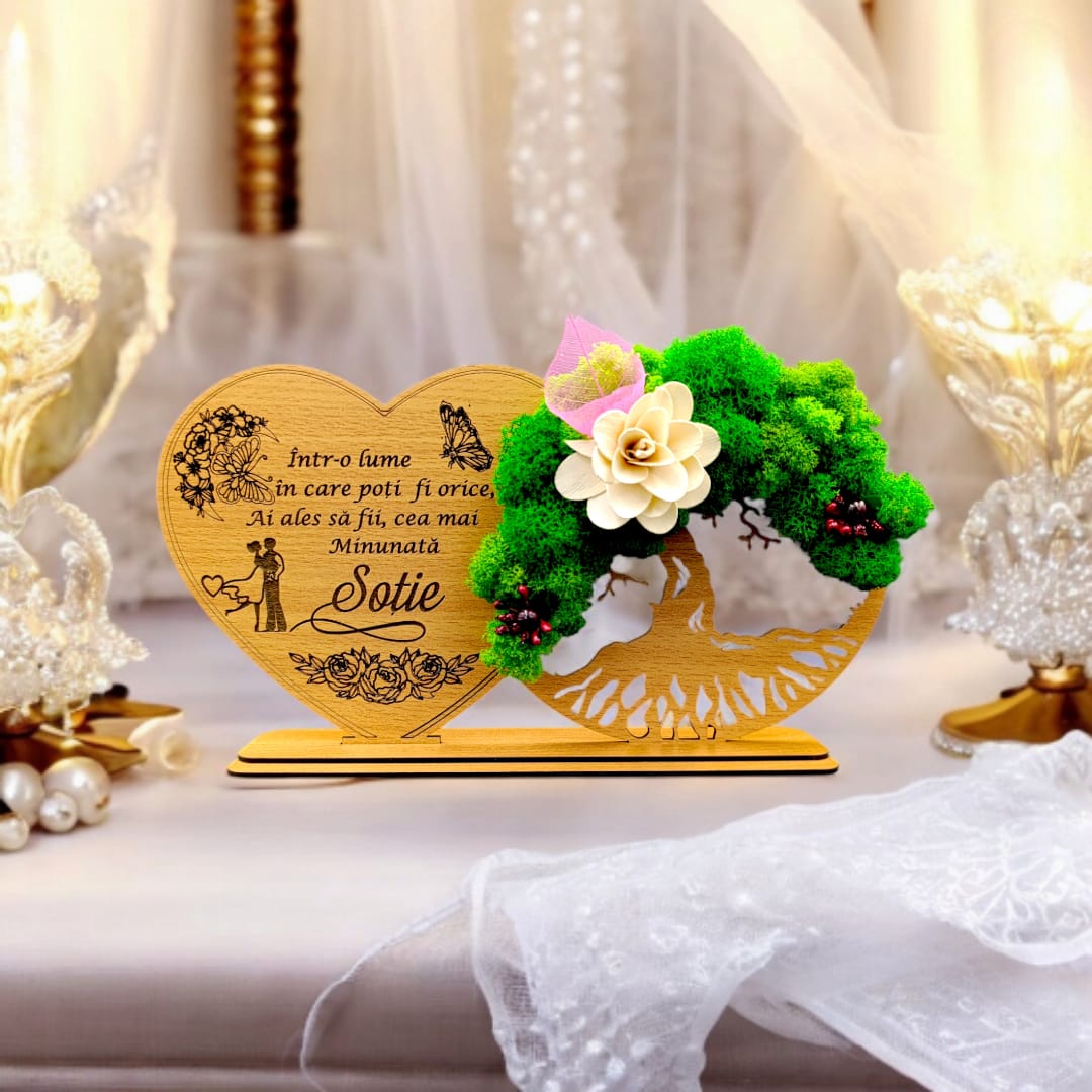 Tablou Inima Copacul vietii decorativ cu suport, personalizat pentru Sotie "Intr-o lume in care poti fi orice..." , Produs în România de Rustic Wood Decor, dimensiune 30x16cm