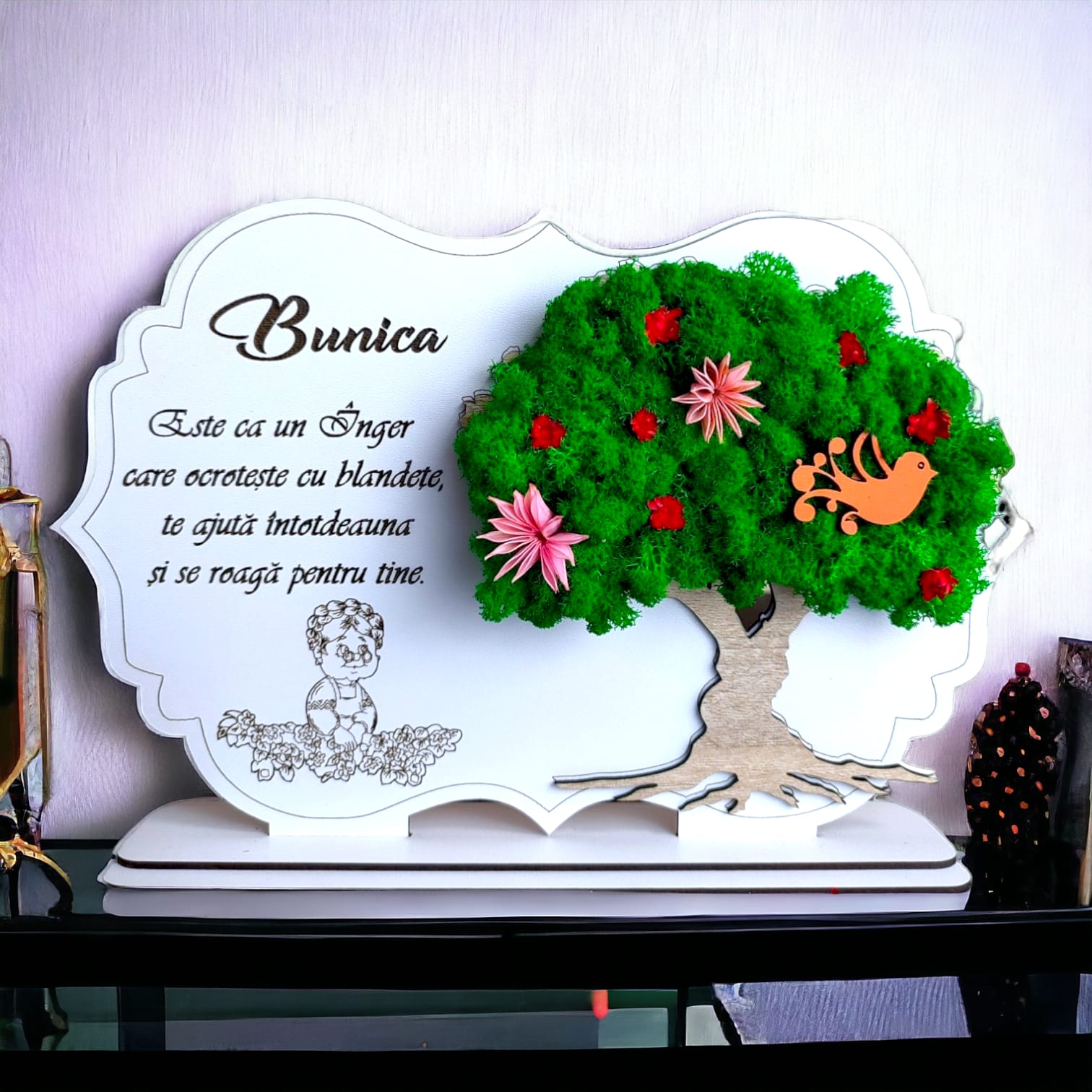 Tablou copac cu licheni stabilizati, personalizat cu mesaj standard, cadou pentru Bunica, dimensiune 30x20cm, verde
