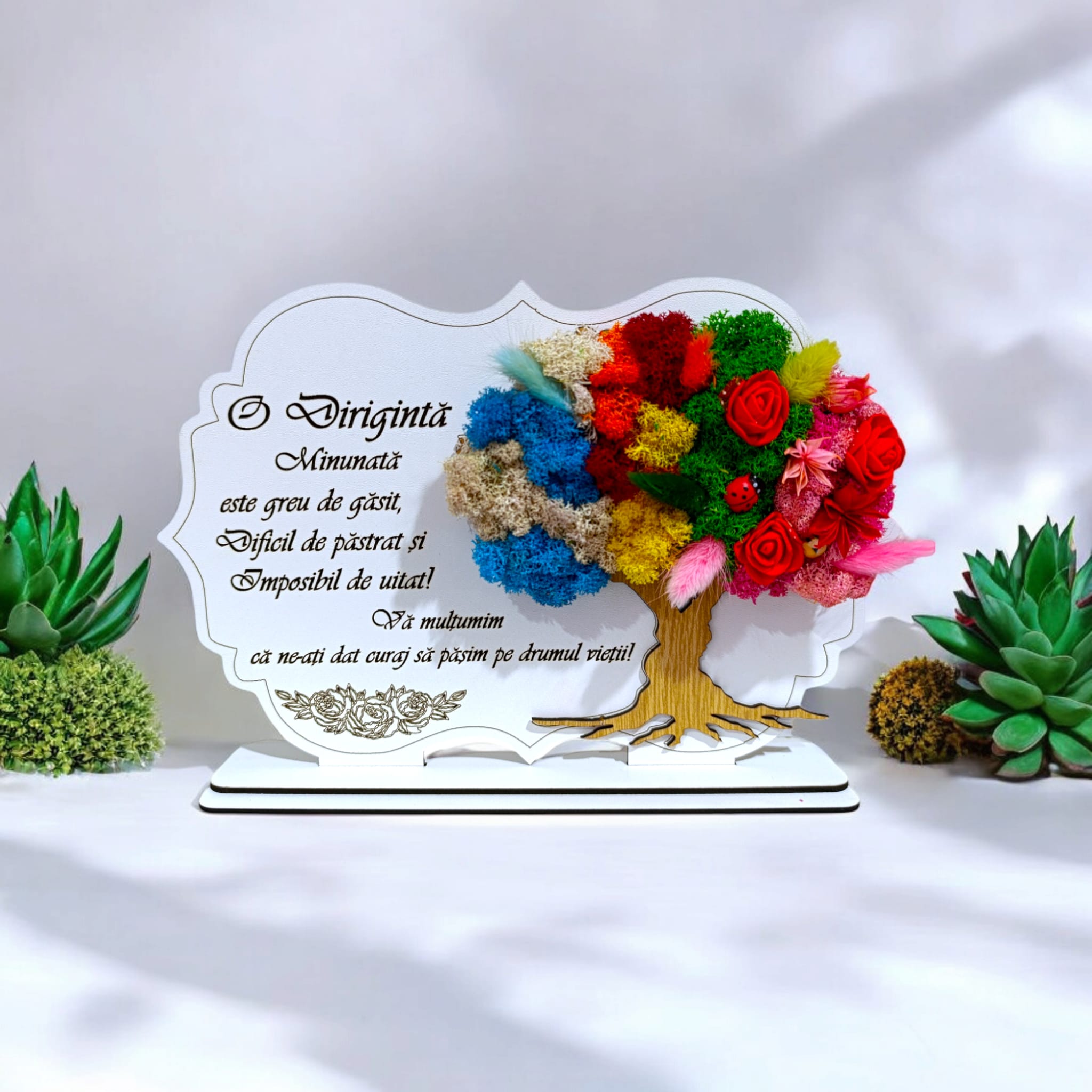 Tablou copac cu licheni stabilizati, personalizat cu mesaj standard, cadou pentru Diriginta, dimensiune 30x20cm